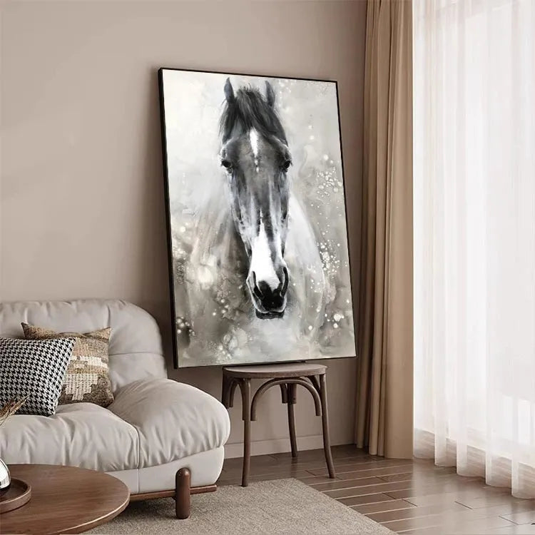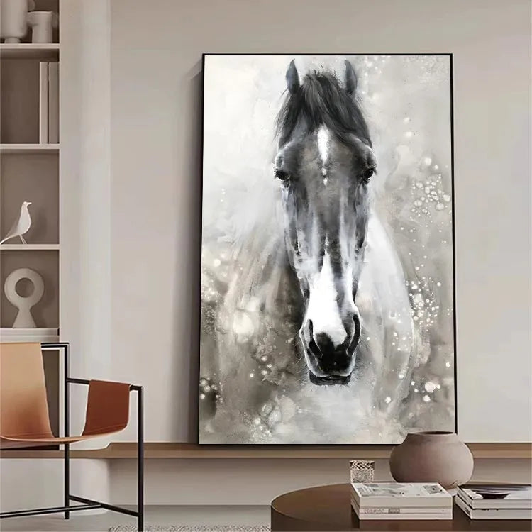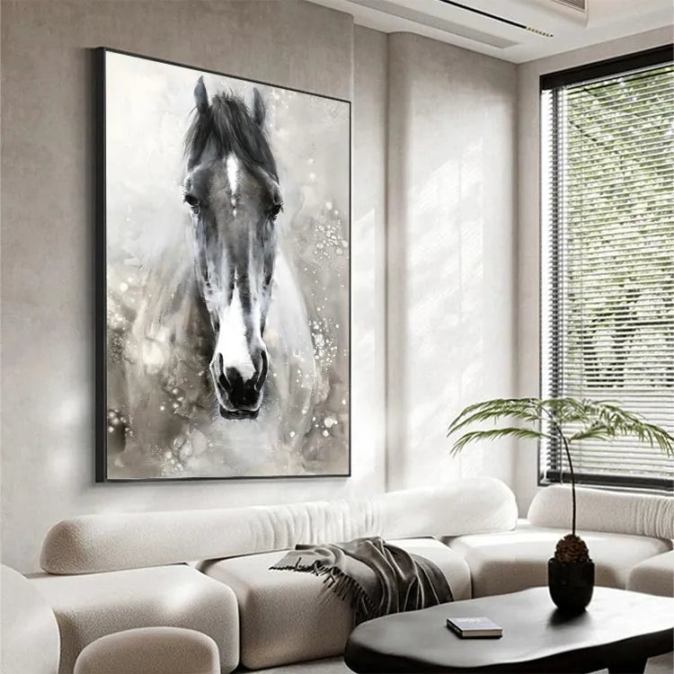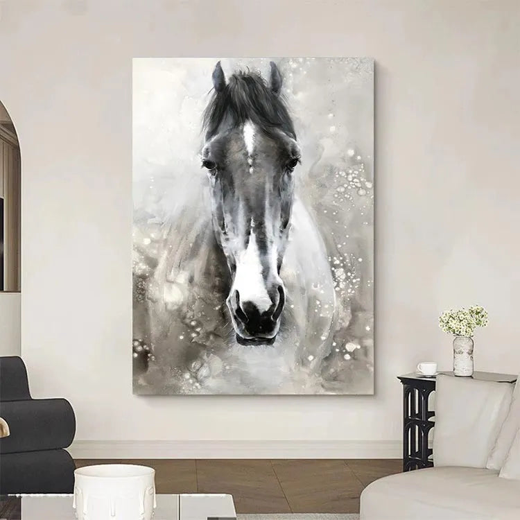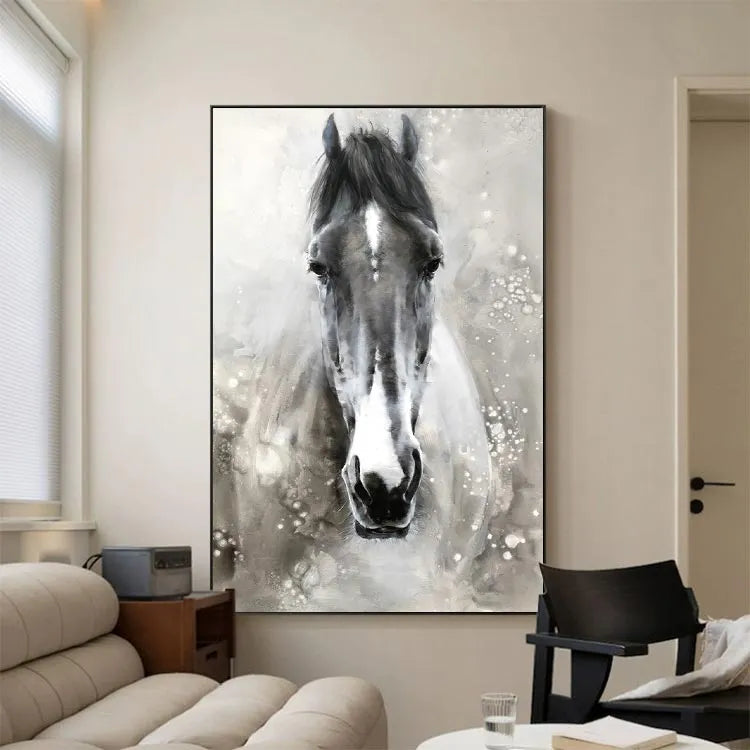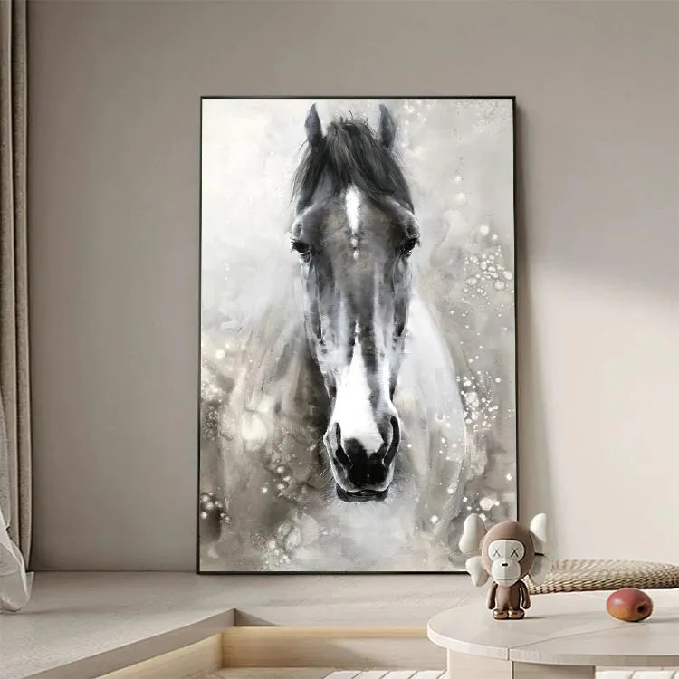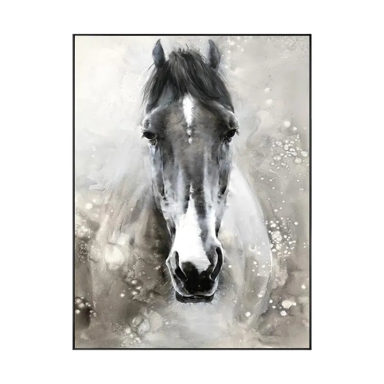 This oil painting features a close-up portrait of a horse, characterized by its monochromatic, grayscale palette. The artist employs a realistic style, yet the texture and brushstrokes introduce a dreamlike, ethereal quality. The horse's eyes, rendered with delicate precision, draw the viewer's gaze, while the white stripe on its forehead serves as a focal point. The use of light and shadow is subtle, with soft, diffused highlights enhancing the horse's majestic presence. The background, with its abstract, splattered white dots, adds a sense of movement and depth, suggesting a mystical or otherworldly environment. The painting's texture, achieved through visible brushstrokes, adds a tactile dimension, reminiscent of Impressionism's emphasis on capturing light and movement.