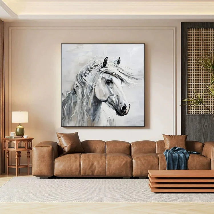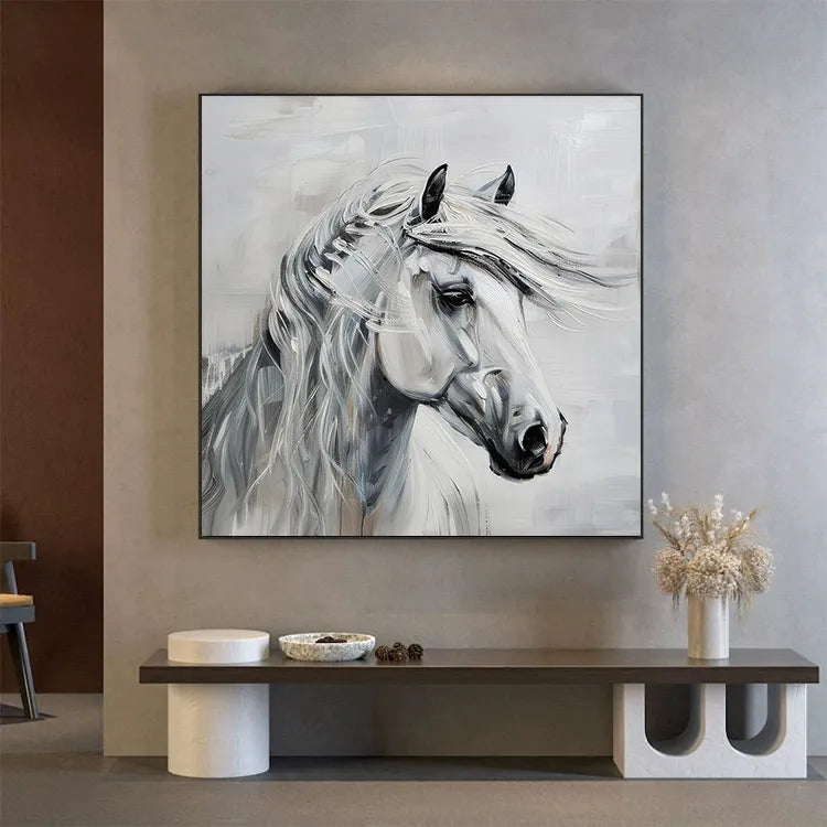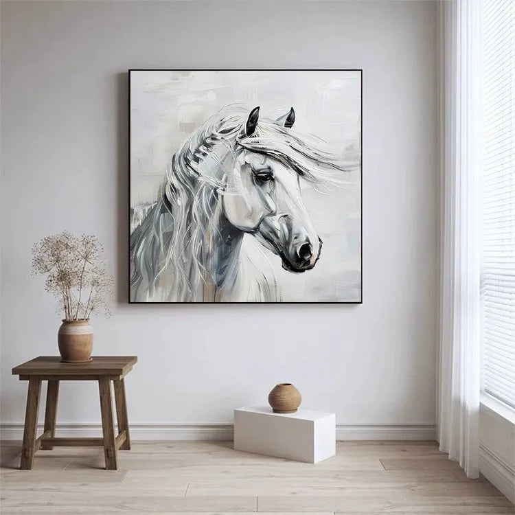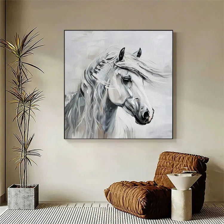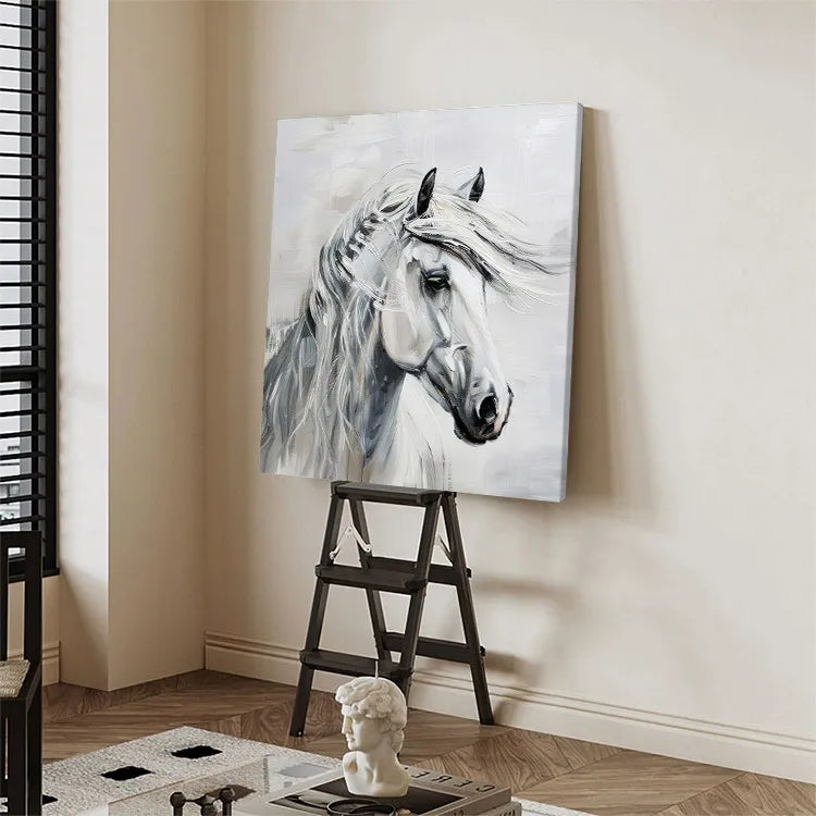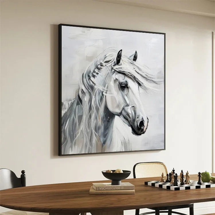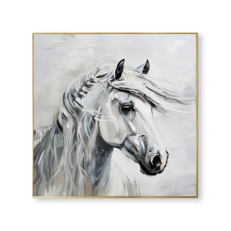 This oil painting of a white horse exemplifies a contemporary realist style with a subtle impressionist influence. The composition focuses on the horse's head, capturing its serene and contemplative expression. The artist employs a limited color palette, predominantly using shades of white, grey, and black, which enhances the horse's ethereal presence. The use of light and shadow is masterful, with delicate, almost ethereal brushstrokes that create a sense of movement in the horse's mane, while the background remains softly blurred, directing attention to the subject. The texture is smooth yet nuanced, with visible brushstrokes adding depth and life to the horse's fur. This work may belong to the modern realism movement, emphasizing realistic representation with a touch of impressionist sensitivity.
