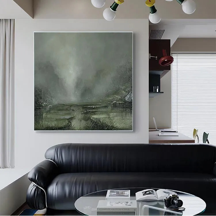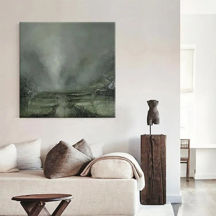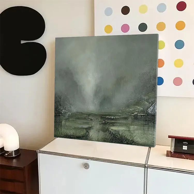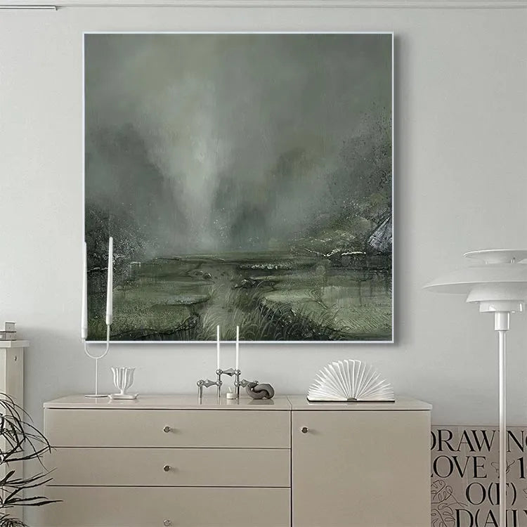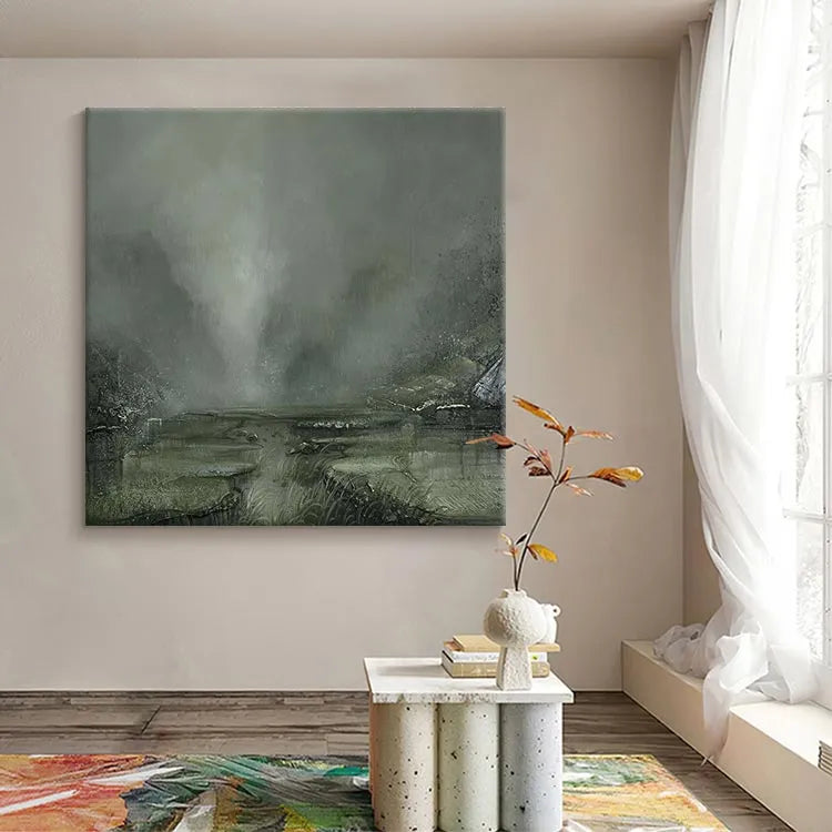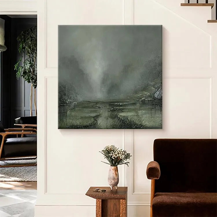 This oil painting exhibits a moody, atmospheric style with a focus on natural landscapes. The composition features a misty, foggy scene with a reflective water surface in the foreground, leading the eye towards a vague, mist-covered horizon. The color palette is predominantly green and gray, creating a somber, tranquil mood. The brushstrokes are loose and textured, adding a sense of movement and depth to the fog. The light is diffused, with subtle highlights that suggest a low-light, overcast sky. The style is reminiscent of the Romantic movement, with its emphasis on nature's sublime beauty and emotional impact. The texture of the brushwork and the subtle gradations of color evoke a sense of mystery and introspection.