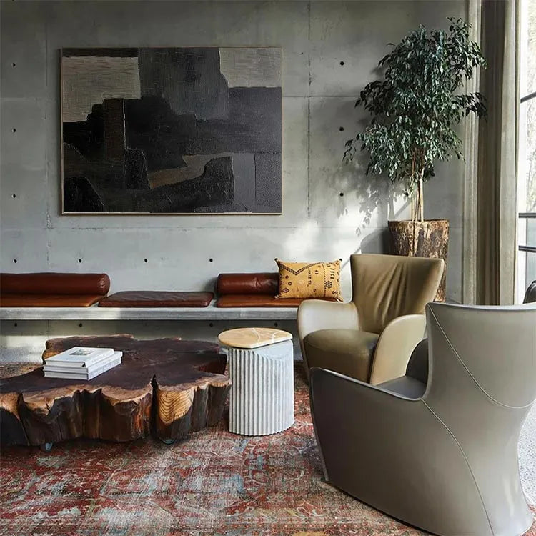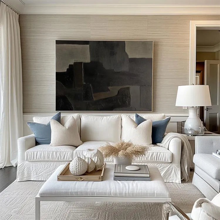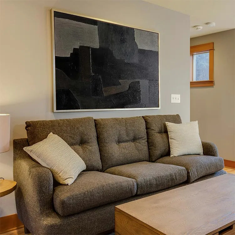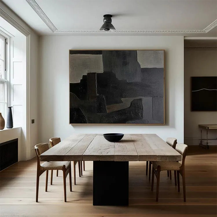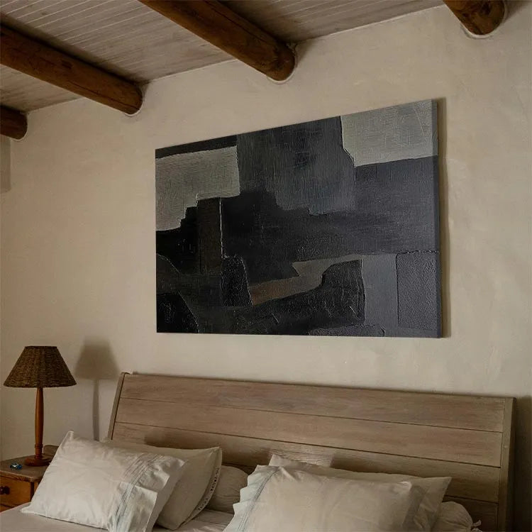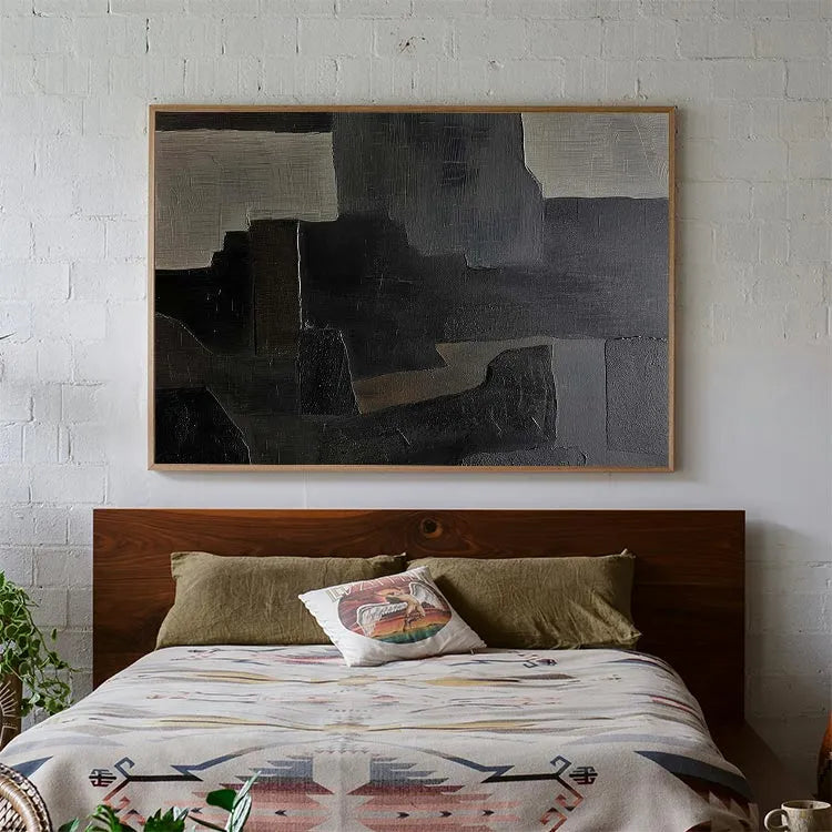 This oil painting employs a modern abstract style, characterized by its geometric, rectangular forms and muted color palette. The composition features a series of overlapping, textured rectangles in shades of gray, black, and beige, creating a sense of depth and layering. The brushstrokes are visible, adding a tactile quality to the otherwise smooth surfaces. The use of color is restrained, yet effective, with the beige rectangles providing subtle contrast against the darker hues. The texture varies from smooth to slightly rough, suggesting a deliberate play between light and shadow. This work may belong to the Abstract Expressionism movement, with its emphasis on form and texture over representation. The overall effect is one of quiet introspection and subtle complexity.