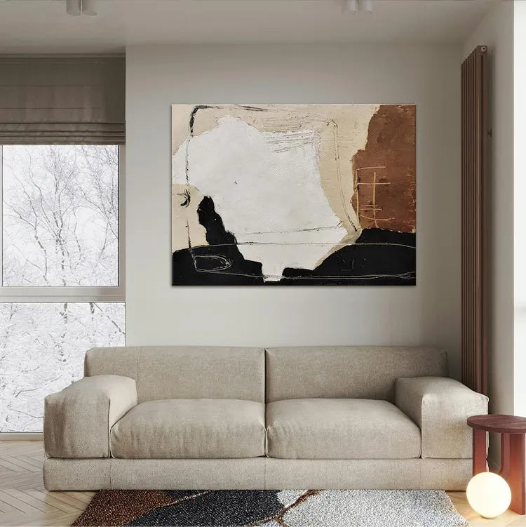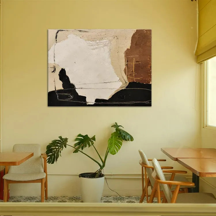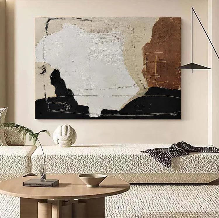 This abstract painting employs a restrained color palette of white, black, brown, and beige, creating a sense of tension and contrast. The textured, almost tactile brushstrokes add a layer of physicality, inviting the viewer to touch. The composition features a central white area, bordered by black and brown sections, with delicate, linear accents that suggest structural elements. The interplay between the smooth and textured areas, along with the use of negative space, aligns with the principles of Abstract Expressionism. The subtle, yet deliberate, use of color and form evokes a contemplative mood, emphasizing the raw, unembellished beauty of the medium.
