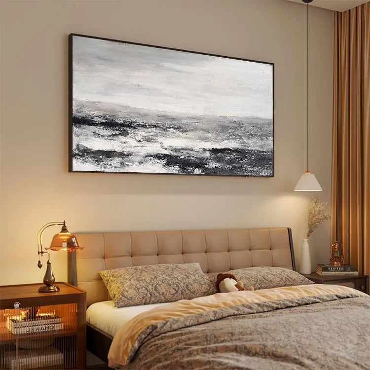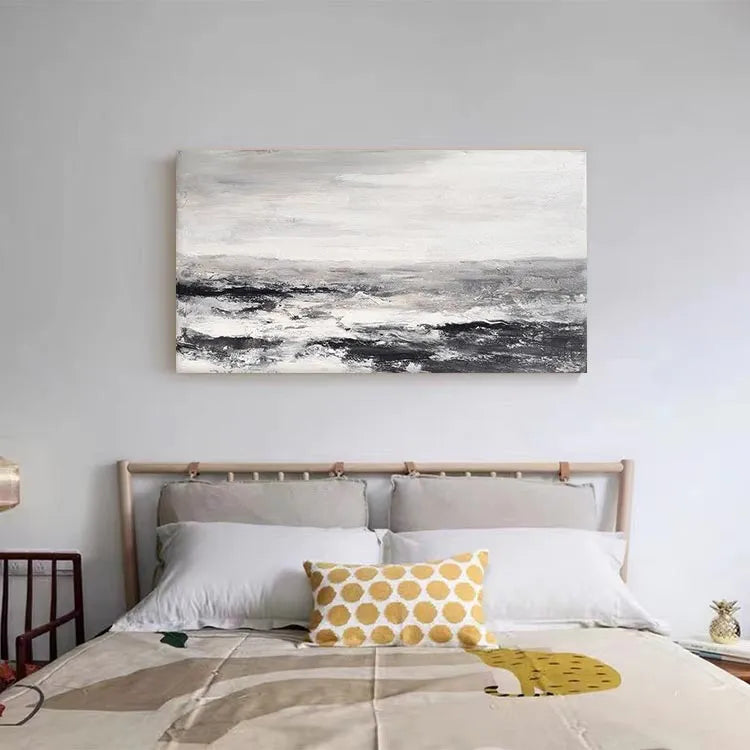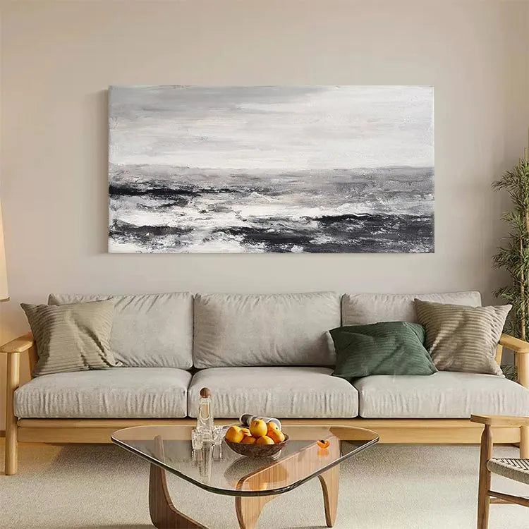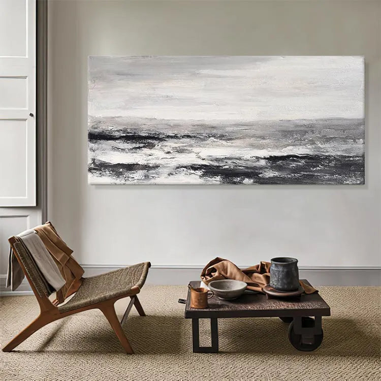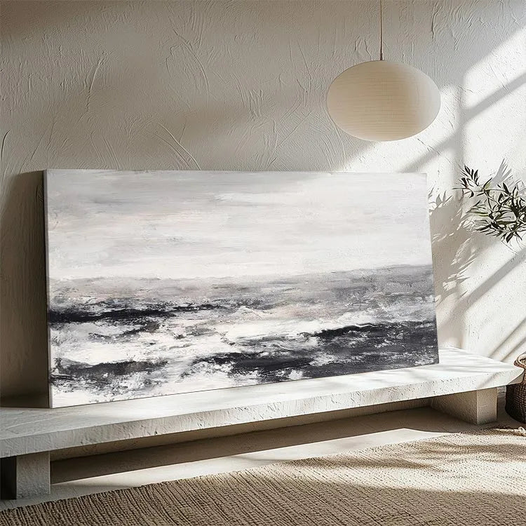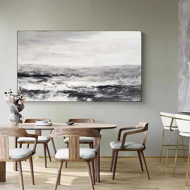 This oil painting exemplifies a minimalist, abstract style, characterized by its restrained palette and emphasis on texture. The composition features a gradient of gray tones, with darker, almost black areas in the lower half and lighter, almost white areas in the upper half. The brushstrokes are thick and expressive, creating a sense of movement and depth, yet the overall effect is subtle and contemplative. The use of color is minimal, focusing on the interplay between light and dark, which evokes a mood of introspection and calm. The texture of the brushstrokes adds a tactile quality, enhancing the visual impact. This work likely belongs to the abstract expressionist movement, with its emphasis on emotional expression through non-representational forms.