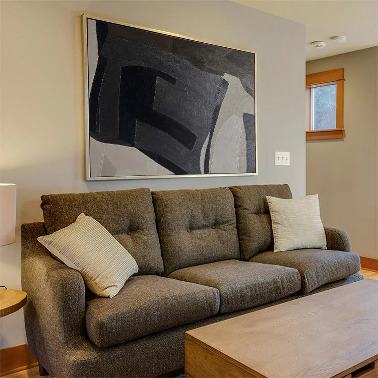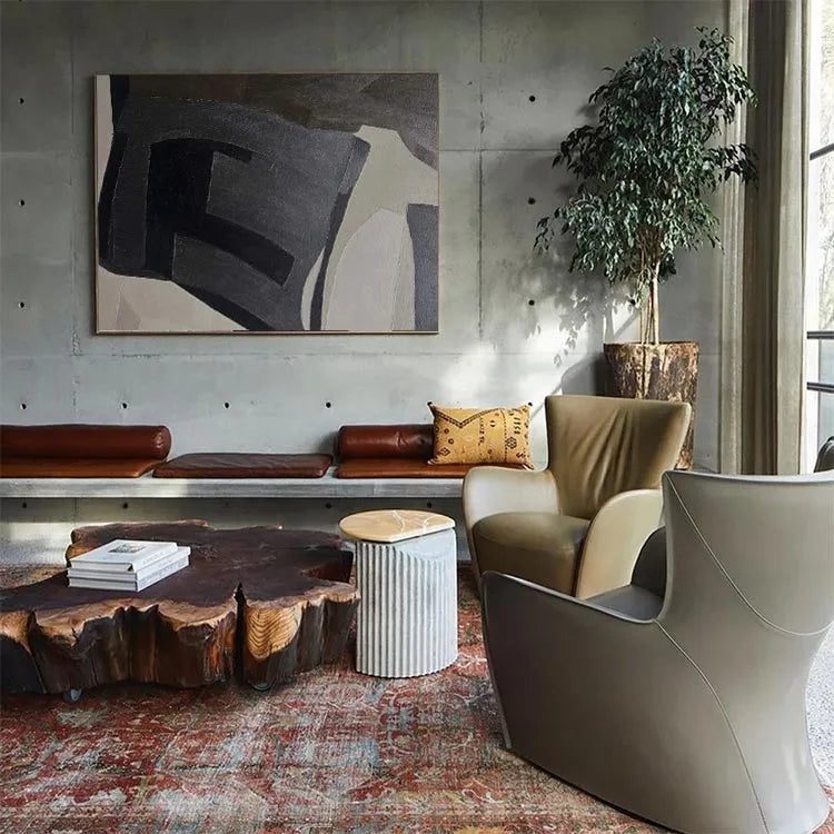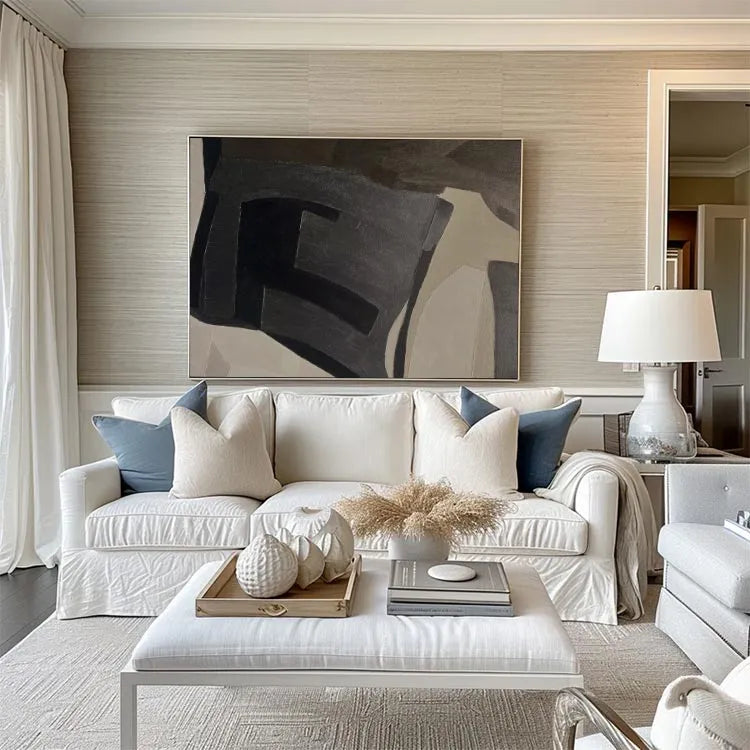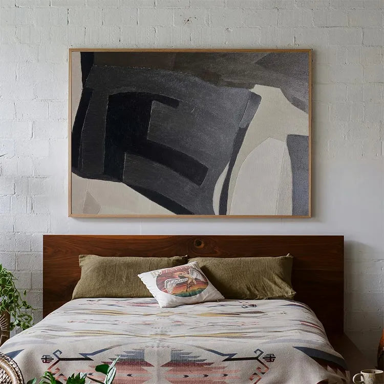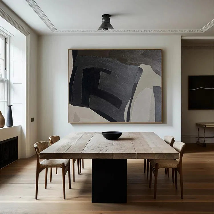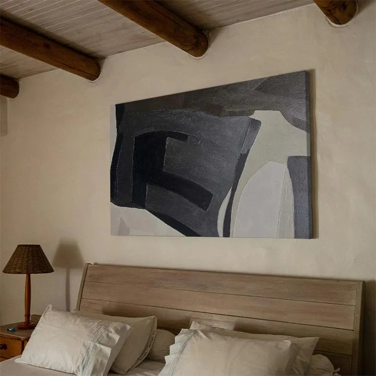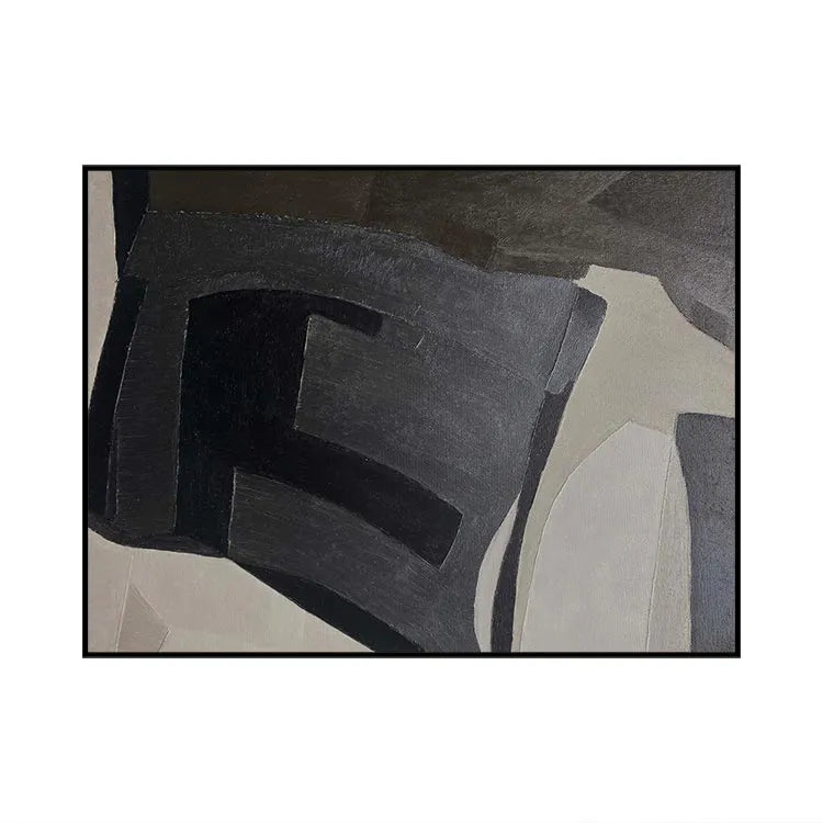 This oil painting showcases a geometric abstract composition, characterized by its use of bold, intersecting shapes and a limited color palette of blacks, grays, and beige. The artist employs a textured, almost brush-stroked technique, creating a tactile quality that contrasts with the flat, monochromatic colors. The interplay of light and shadow within the shapes suggests a three-dimensional effect, while the dark, rectangular forms dominate the composition, drawing the viewer's eye inward. The piece evokes the principles of Cubism, with its fragmented forms and emphasis on shape over representation. The subtle gradient transitions between colors enhance the painting's depth and complexity.