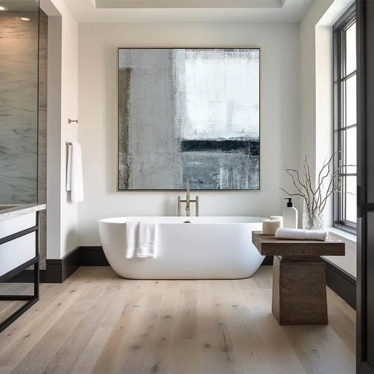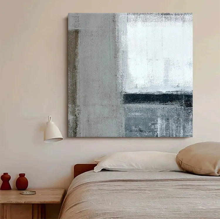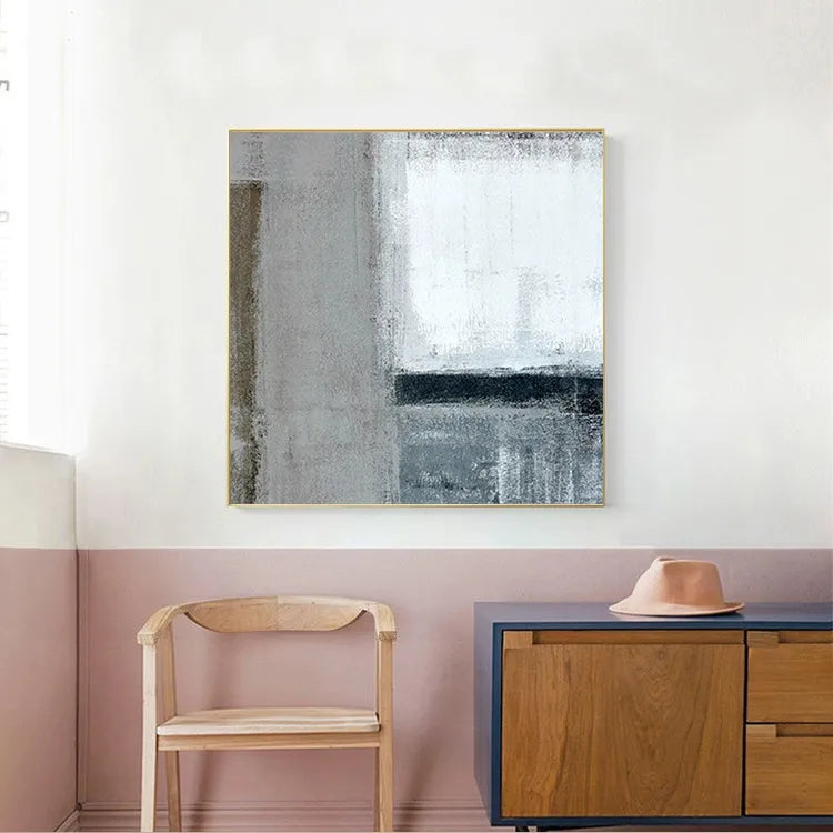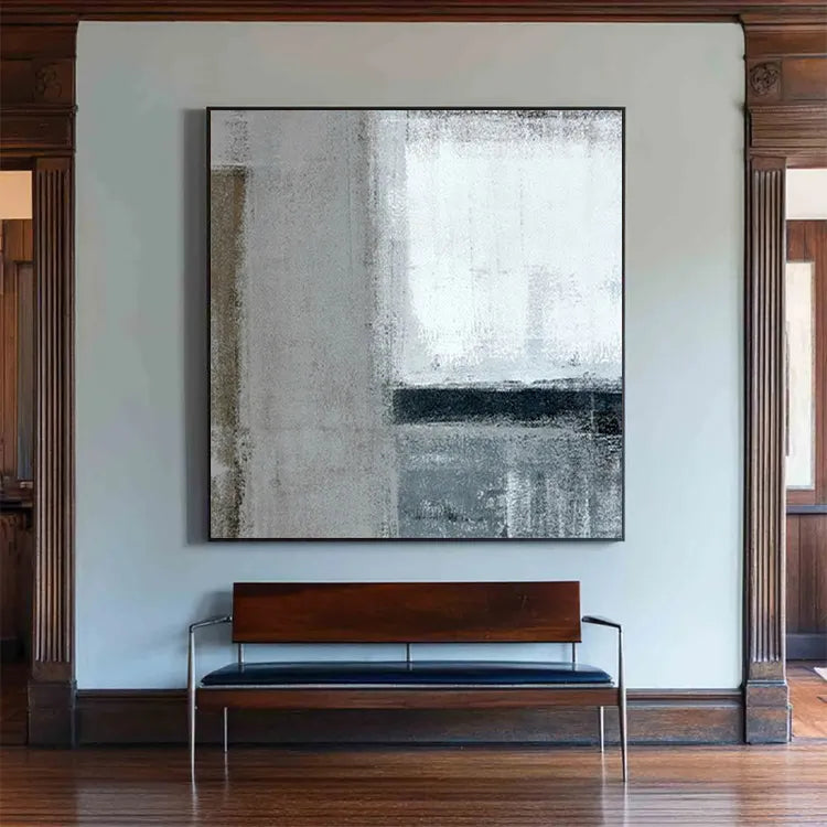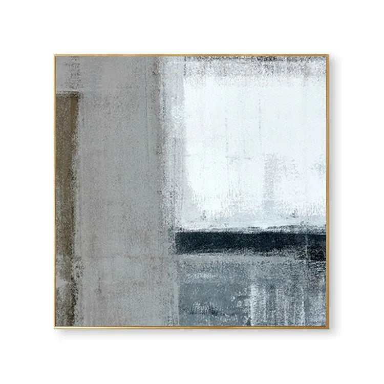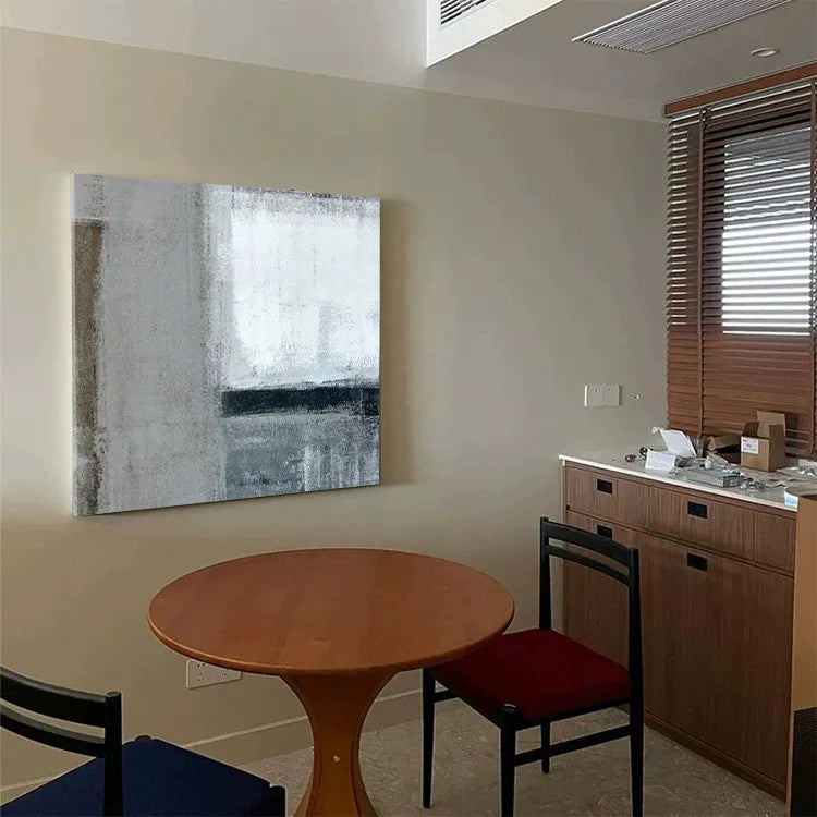 This abstract oil painting exhibits a minimalist style, characterized by its restrained color palette and textured brushwork. The composition features a vertical division, with the left side showcasing a muted, earthy brown, transitioning into a more luminous, white and gray gradient on the right. The textured, almost grainy surface suggests a tactile quality, enhancing the sense of depth. The use of light and shadow creates a subtle, yet dynamic interplay, evoking a sense of calm and introspection. The horizontal black band adds a subtle contrast, guiding the viewer's eye across the piece. This work aligns with the Abstract Expressionist movement, emphasizing the emotional and intuitive aspects of painting.