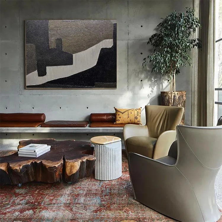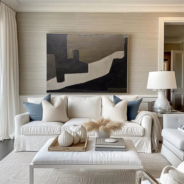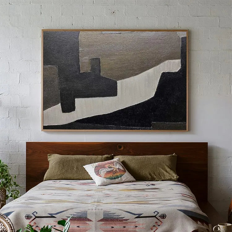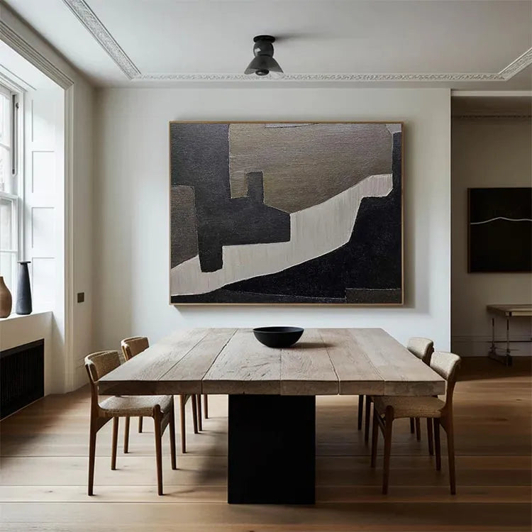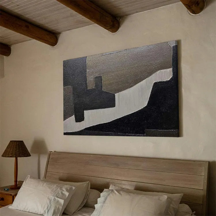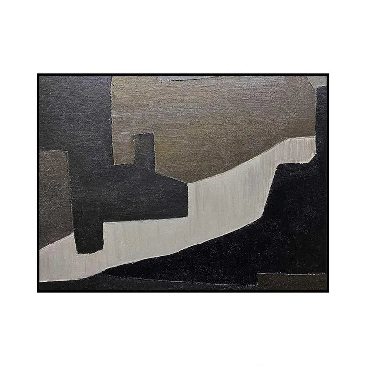 This oil painting employs a geometric, abstract style, reminiscent of early 20th-century modernism. The composition features a series of flat, overlapping shapes in a limited color palette of browns, blacks, and whites. The artist uses these colors to create a sense of depth and contrast, with the darker shapes grounding the lighter ones. The texture of the oil paint is visible, adding a tactile quality to the flat forms. The use of color and light suggests a contemplation of urban architecture, with the white and brown shapes evoking a cityscape's interplay of light and shadow. The painting's simplicity and focus on form and color align it with the Bauhaus movement.
