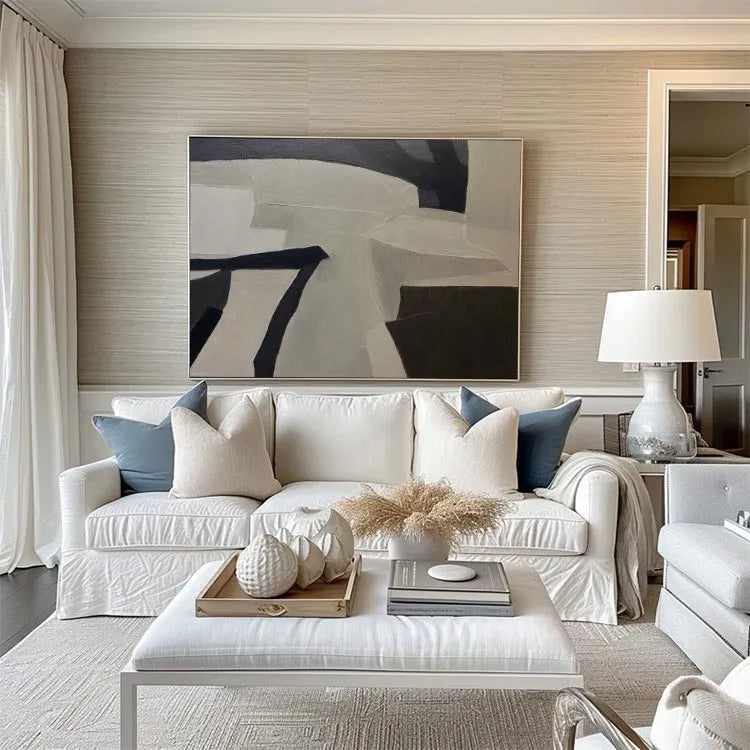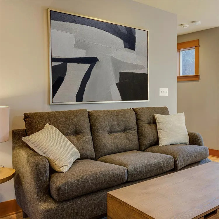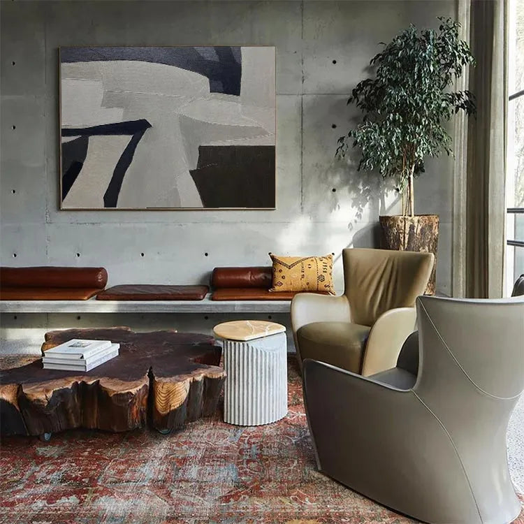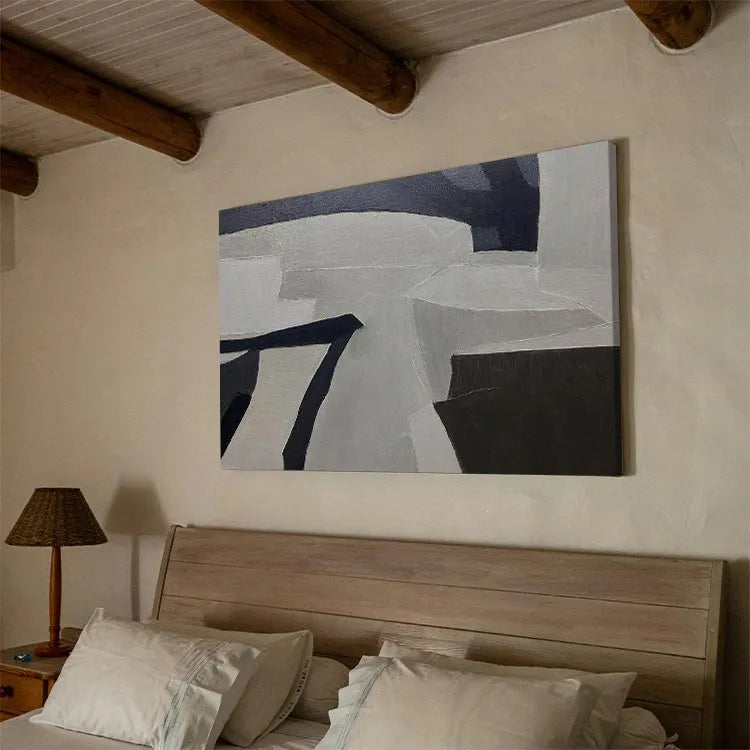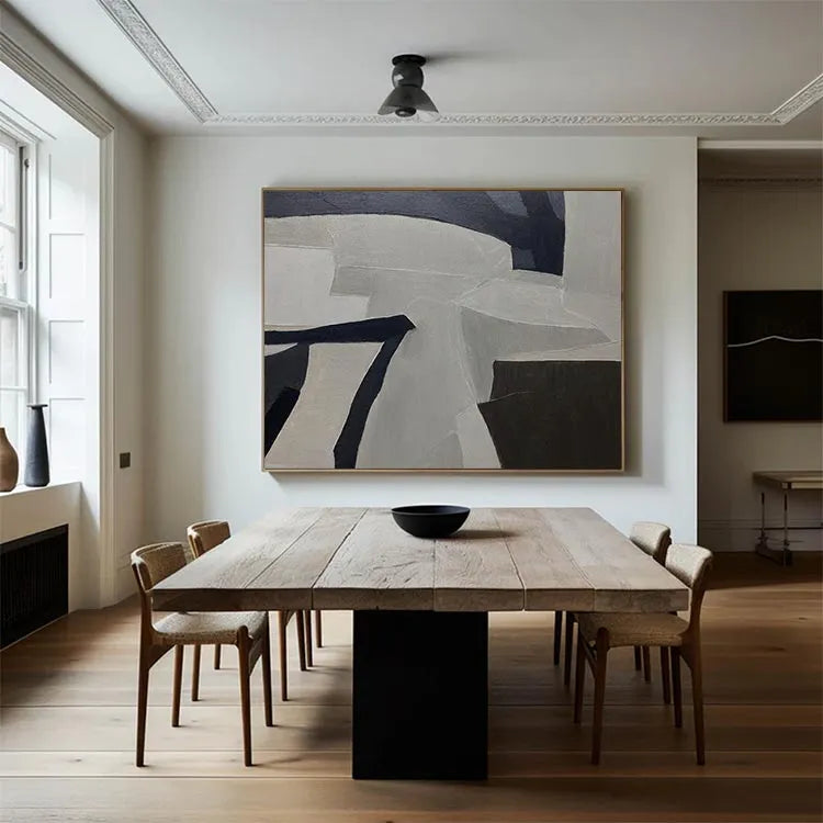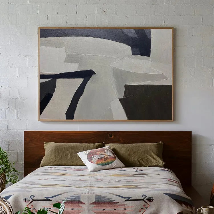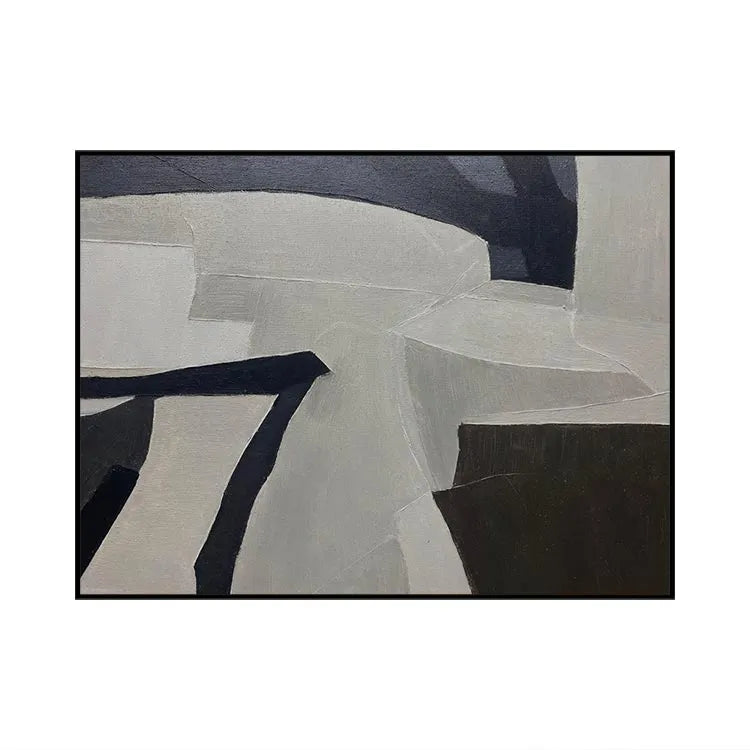 This oil painting features a geometric abstraction characterized by its use of bold, contrasting colors and shapes. The composition is composed of intersecting, angular forms in black, white, gray, and brown, creating a sense of depth and movement. The artist employs a limited color palette, emphasizing the interplay between light and dark areas. The texture of the brushstrokes is visible, adding a tactile quality to the piece. The smooth transitions between colors and the crisp edges of the shapes suggest a modernist influence, possibly aligning with the Cubist movement. The use of color and form evokes a contemplative mood, inviting viewers to explore the relationships between the different elements.