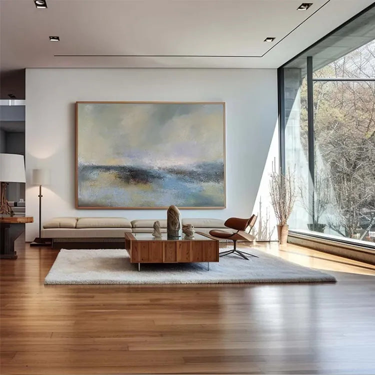 This oil painting exhibits a serene, atmospheric landscape, characterized by its ethereal use of color and texture. The composition is subtle, with a horizontal divide between a cloudy sky and a distant, indistinct shoreline. The color palette is muted, featuring soft blues, greens, and yellows that blend seamlessly, evoking a tranquil, almost melancholic mood. The texture is palpable, with visible brushstrokes that add depth and movement to the painting. The light is diffuse, suggesting an overcast or dawn setting, which enhances the painting's dreamlike quality. The style aligns with the Impressionist movement, focusing on capturing the essence of a moment rather than precise details. The painting's simplicity and emotional resonance are key elements, inviting viewers to interpret and reflect on the scene.