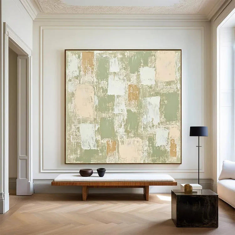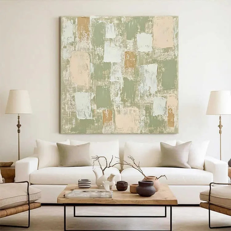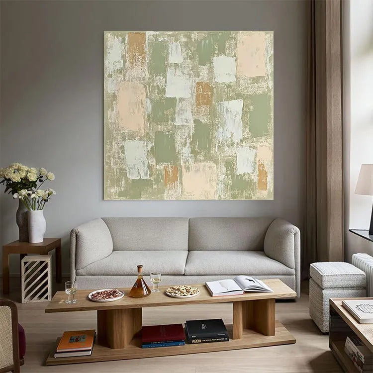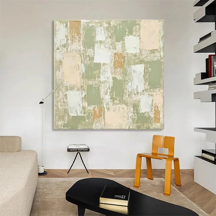 This painting exhibits a textured, abstract style reminiscent of the Abstract Expressionism movement, characterized by its emphasis on texture and spontaneous brushwork. The composition consists of irregular, patch-like shapes in muted green, beige, and white colors, creating a sense of layered depth and fragmentation. The rough, almost worn texture suggests a deliberate use of thick, visible brushstrokes, adding a tactile quality to the visual experience. The juxtaposition of soft pastel hues against the green background evokes a sense of calm yet subtle tension. The use of color is restrained, focusing on earthy tones, which may symbolize a connection to nature or the passage of time. The overall effect is one of quiet contemplation and introspection, inviting the viewer to explore the interplay between color, texture, and form.