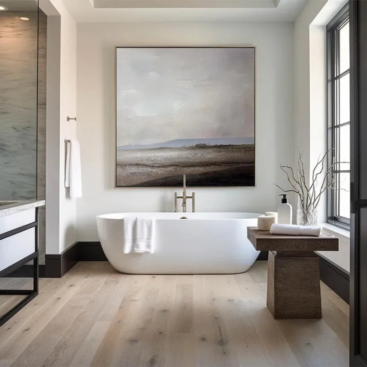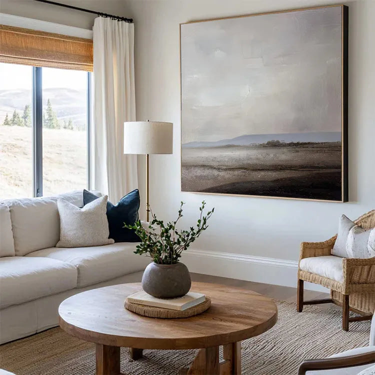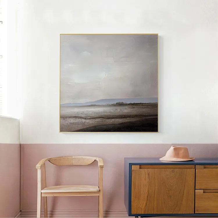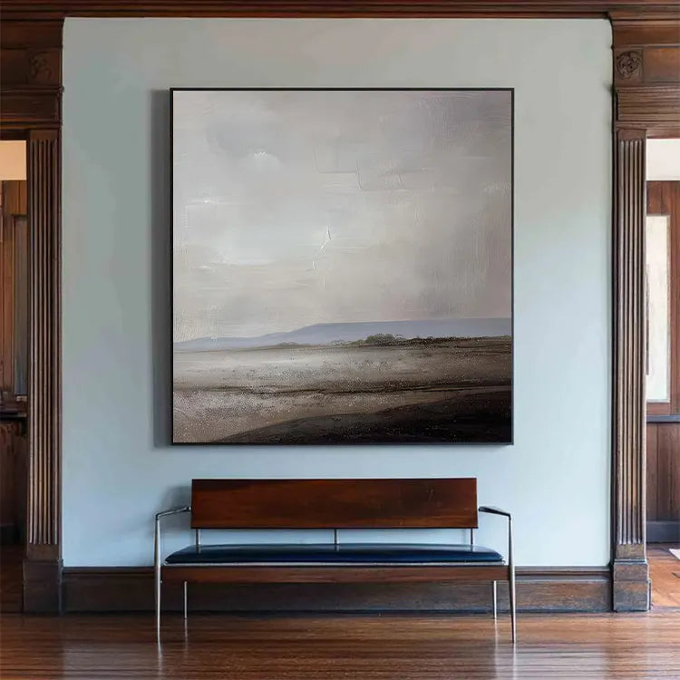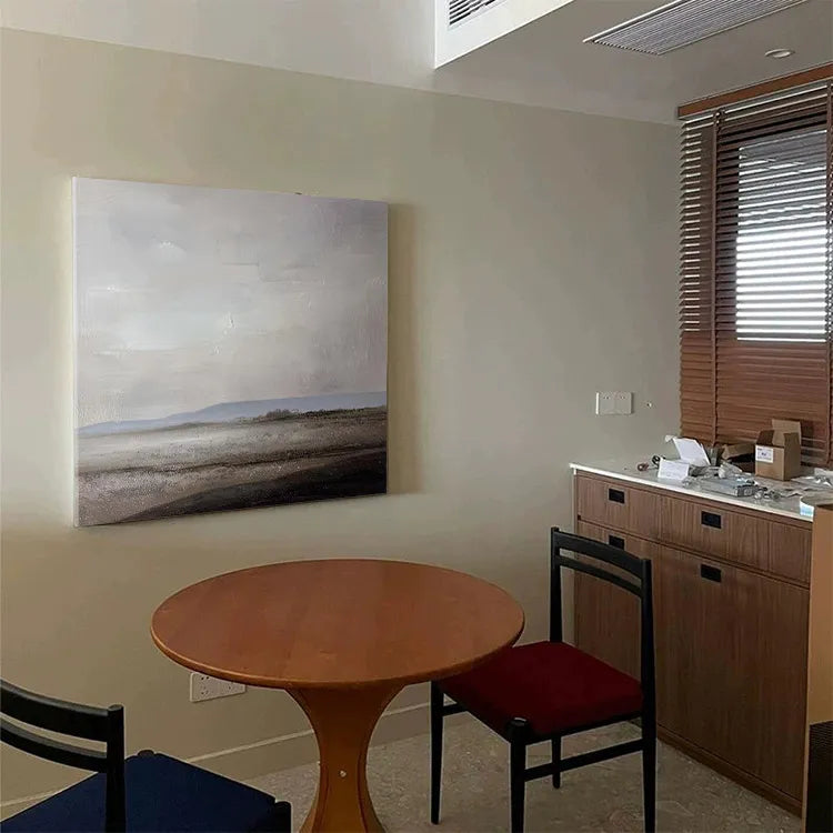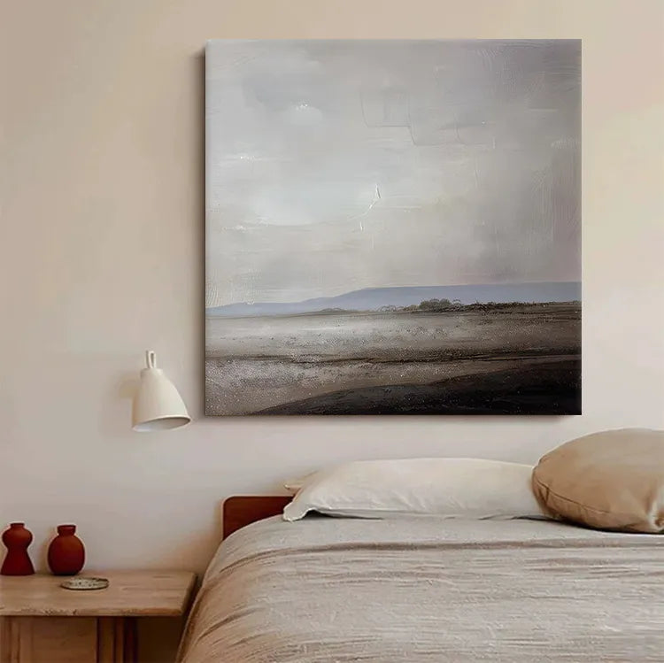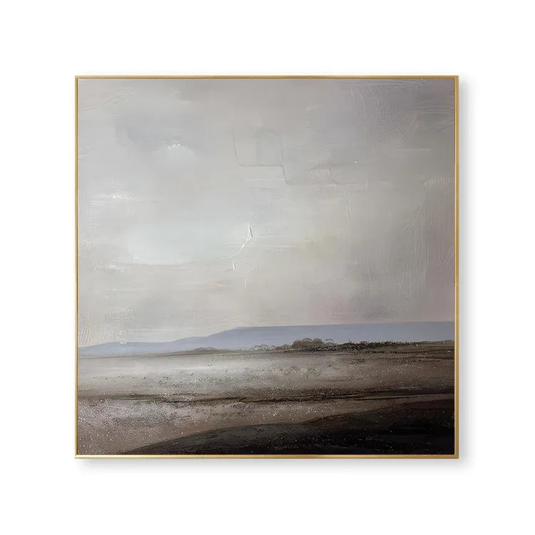 This oil painting presents a minimalist, almost abstract landscape, characterized by its subdued color palette and textured brushwork. The composition features a vast, flat horizon line, with a muted, grayish sky that dominates the upper portion of the canvas. The lower half depicts a desolate, barren landscape with subtle hints of a shoreline. The use of color is restrained, with soft grays, browns, and hints of blue, creating a melancholic, serene mood. The texture is evident in the visible brushstrokes, adding a tactile quality to the smooth, almost ethereal sky. This work aligns with the principles of Minimalism and Abstract art, emphasizing mood and atmosphere over detailed representation. The subtle gradation of light and shadow suggests a calm, introspective moment.