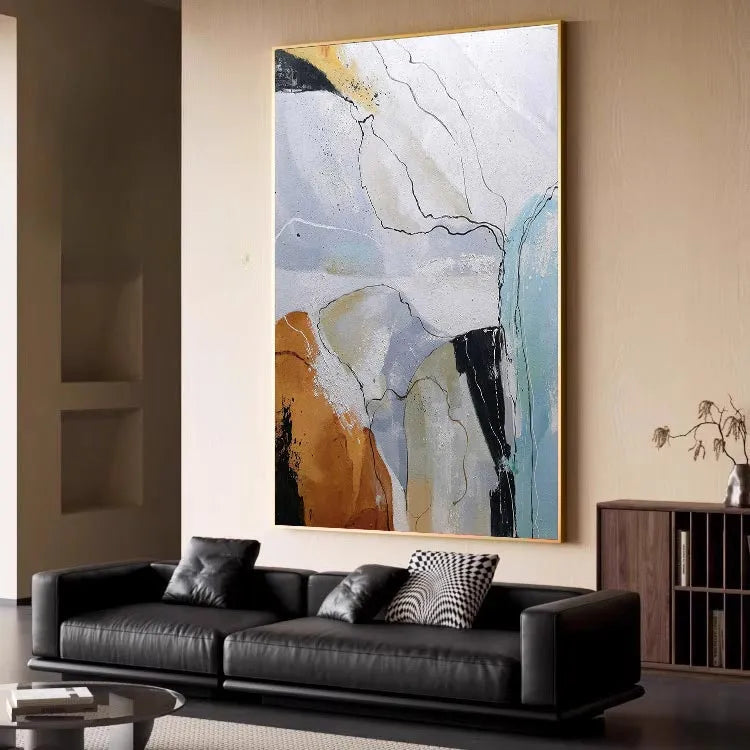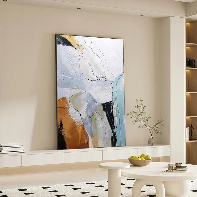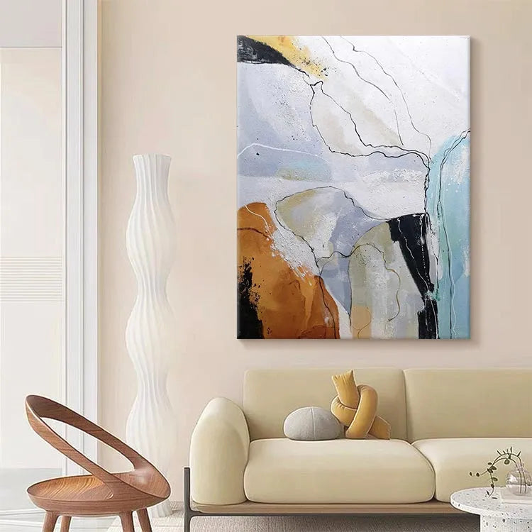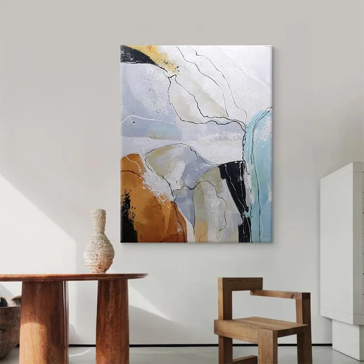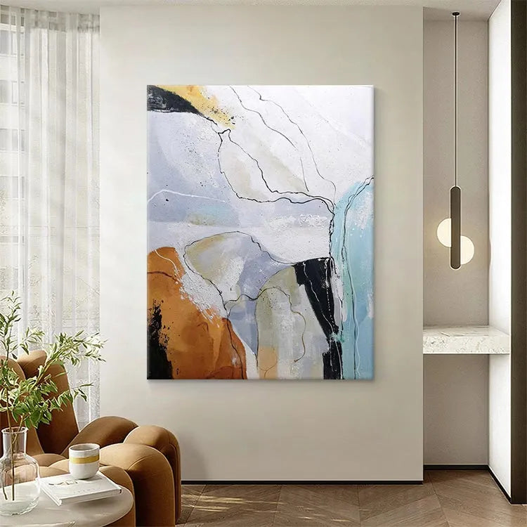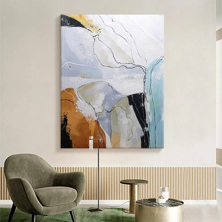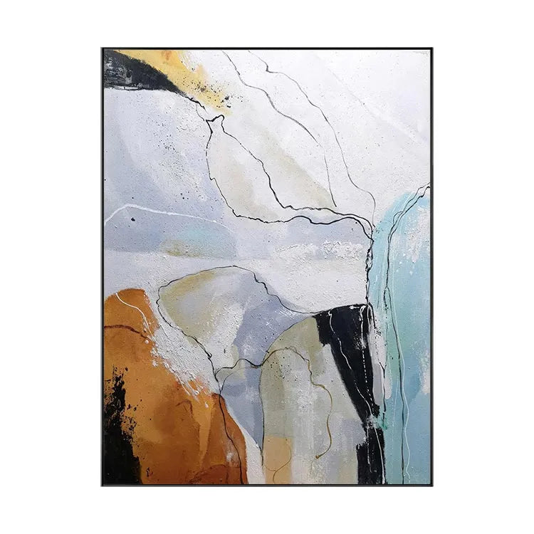 This oil painting exhibits a modern abstract style, characterized by its non-representational forms and use of color. The composition features a dynamic interplay of lines and shapes, with black, white, and gray lines creating a network-like pattern across a textured, white background. Warm, earthy tones of brown and orange contrast with cooler blues and grays, adding depth and movement. The texture of the paint is visible, with visible brushstrokes and a rough, almost cracked surface that adds a tactile quality. The use of color and line suggests a balance between chaos and order, reminiscent of the Abstract Expressionist movement. The painting’s subtle interplay of light and dark areas enhances its three-dimensional effect.