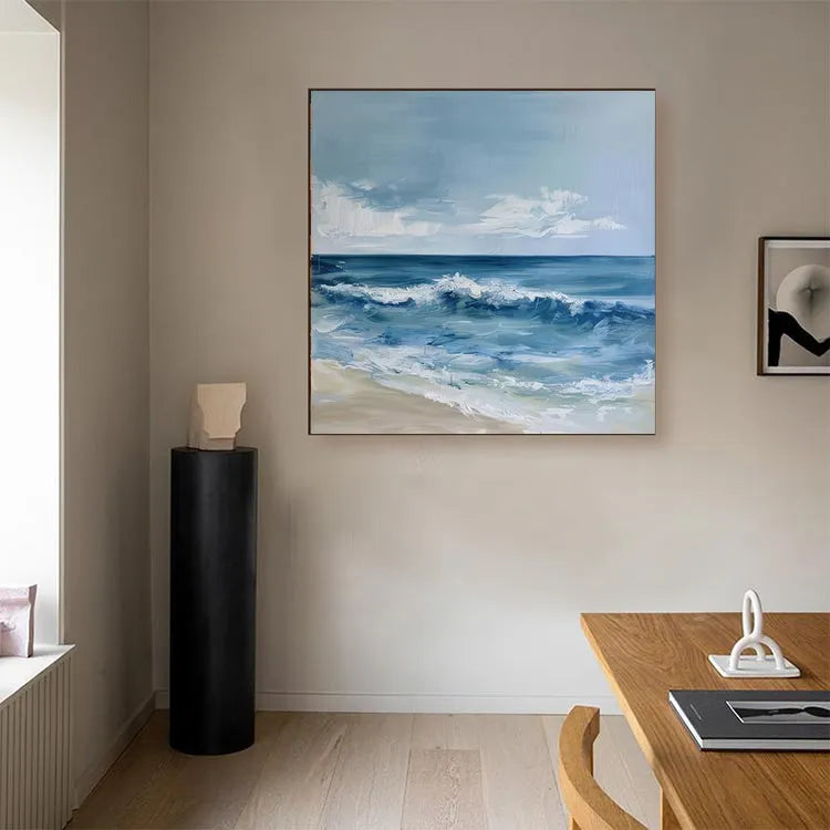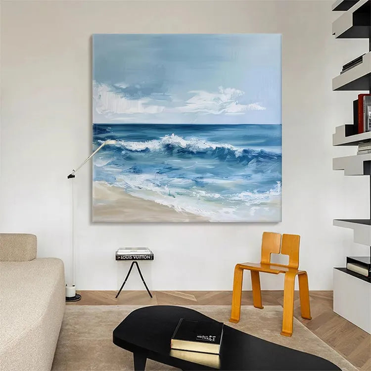 This painting, likely belonging to the modern or contemporary art movements, employs a serene, almost ethereal composition of a beach scene. The artist uses a restrained color palette dominated by various shades of blue and white, evoking a sense of calm and tranquility. The brushstrokes are loose and expressive, with visible textures that suggest the movement of the waves and the gentle breeze. The sky is depicted with soft, diffuse brushstrokes, contrasting with the more defined, swirling brushstrokes of the ocean. The light is subtle, with a gentle gradient from the sky to the water, enhancing the sense of depth. The overall style is impressionistic, focusing on capturing the essence and mood of the scene rather than precise detail.