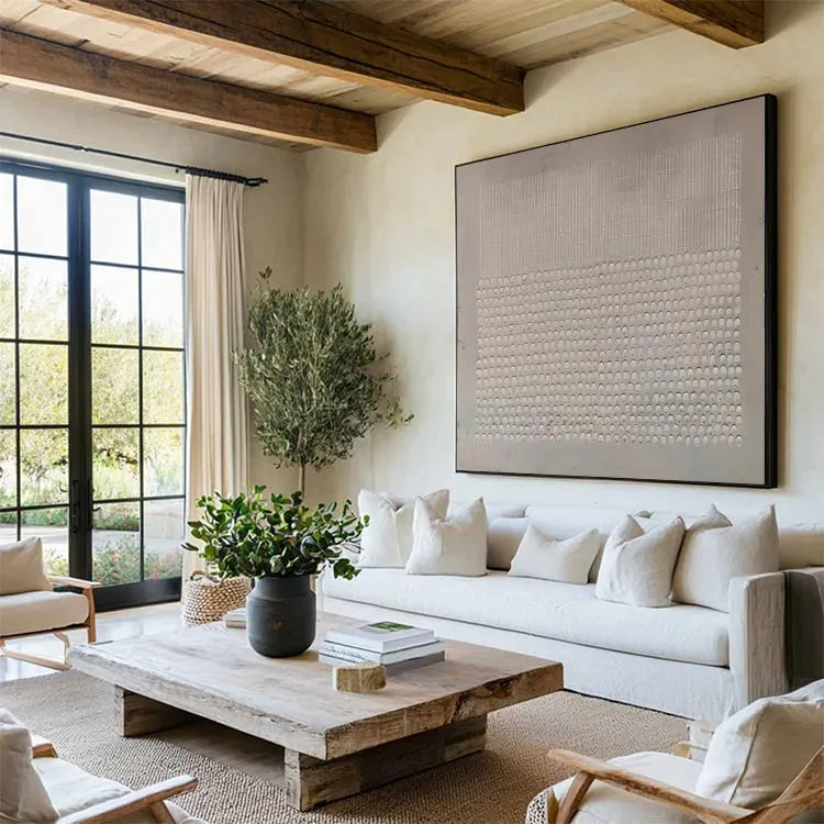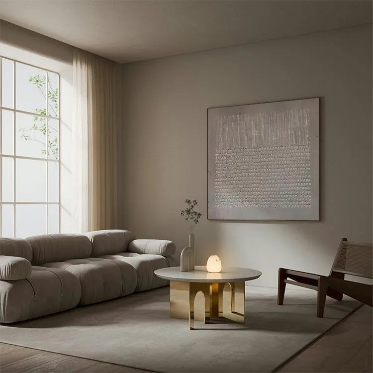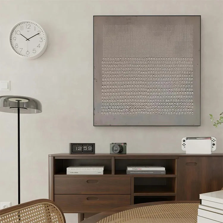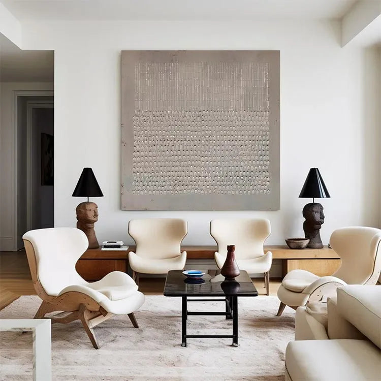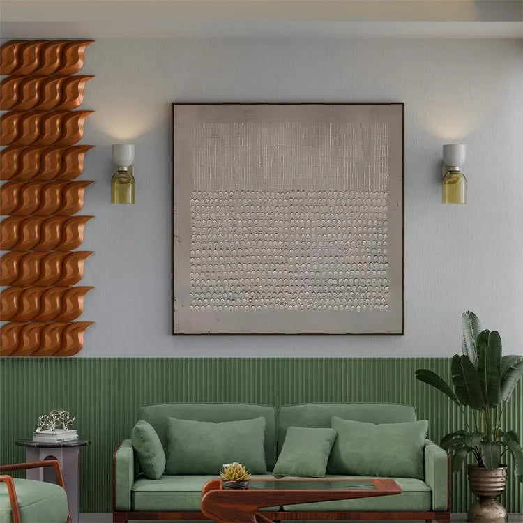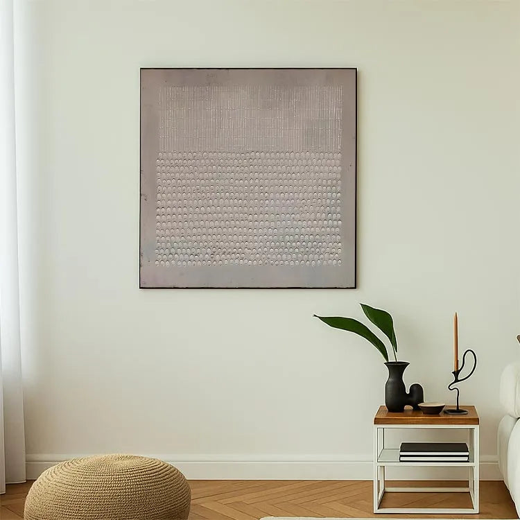 This minimalist painting features a repetitive pattern of small, semi-circular indentations arranged in a grid-like fashion. The top section consists of vertical, evenly spaced lines, while the bottom section is filled with the semi-circular indentations, creating a stark contrast. The use of a monochromatic palette and the subtle texture suggests a modernist approach, reminiscent of Bauhaus or De Stijl movements. The uniformity and precision in the pattern evoke a sense of order and simplicity, while the slight gradient in the background adds depth. The texture, likely created through relief printing or etching, enhances the tactile quality of the work. The composition's geometric precision and restrained color palette underscore the artist's interest in form and structure.