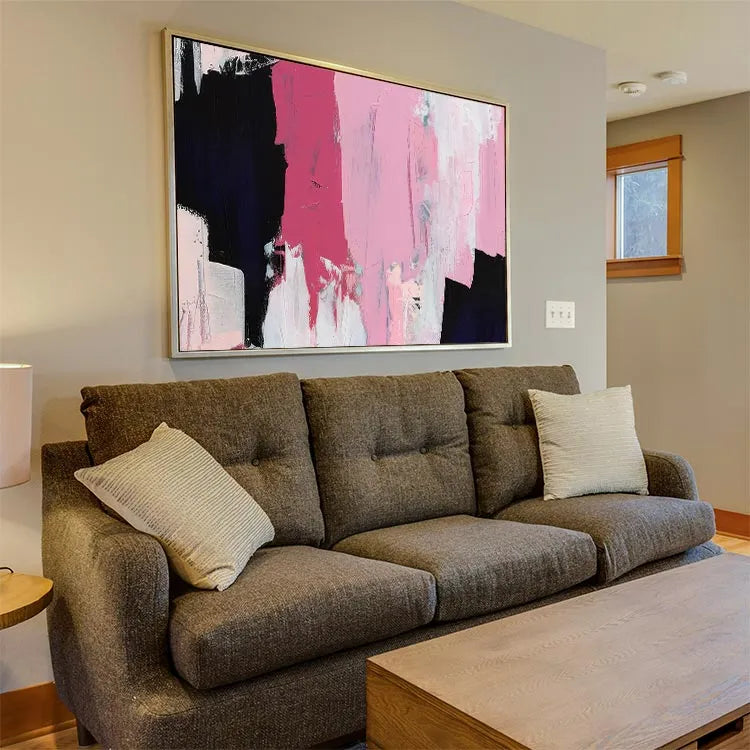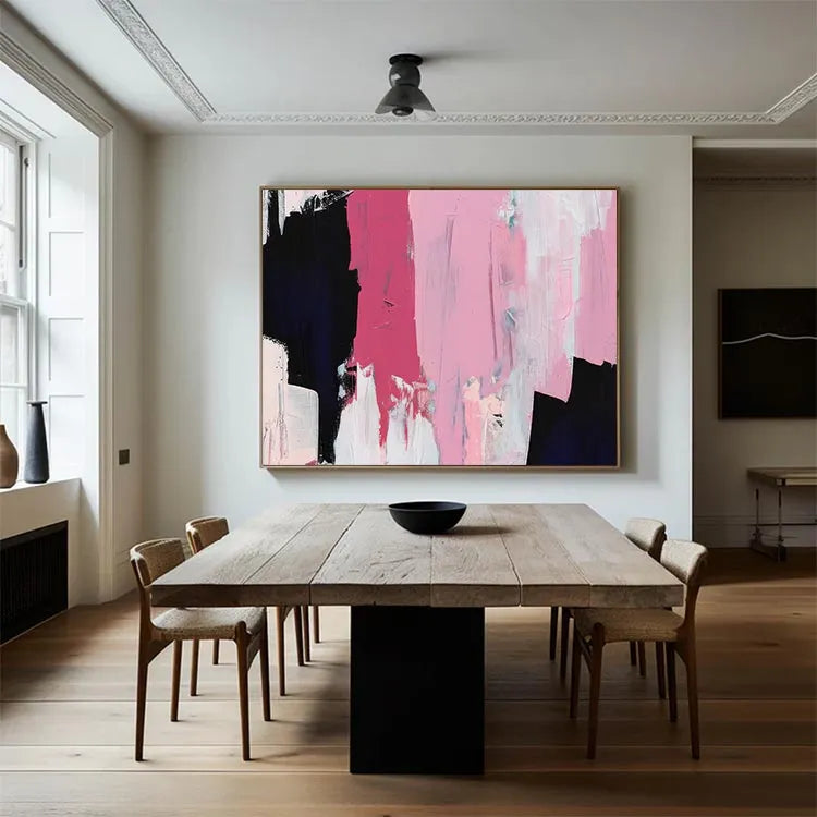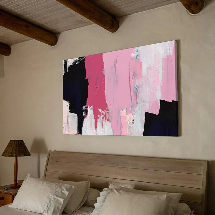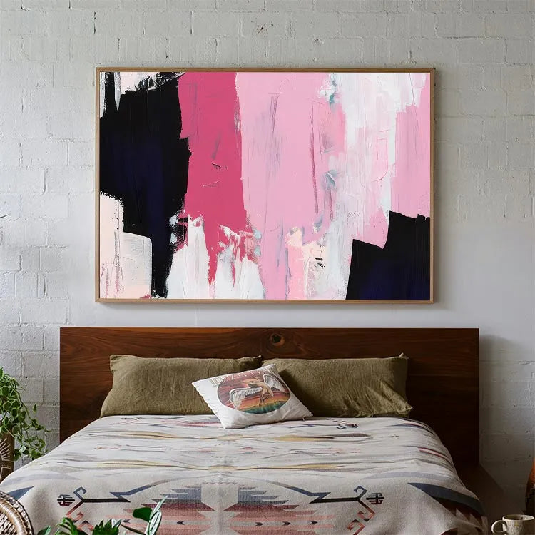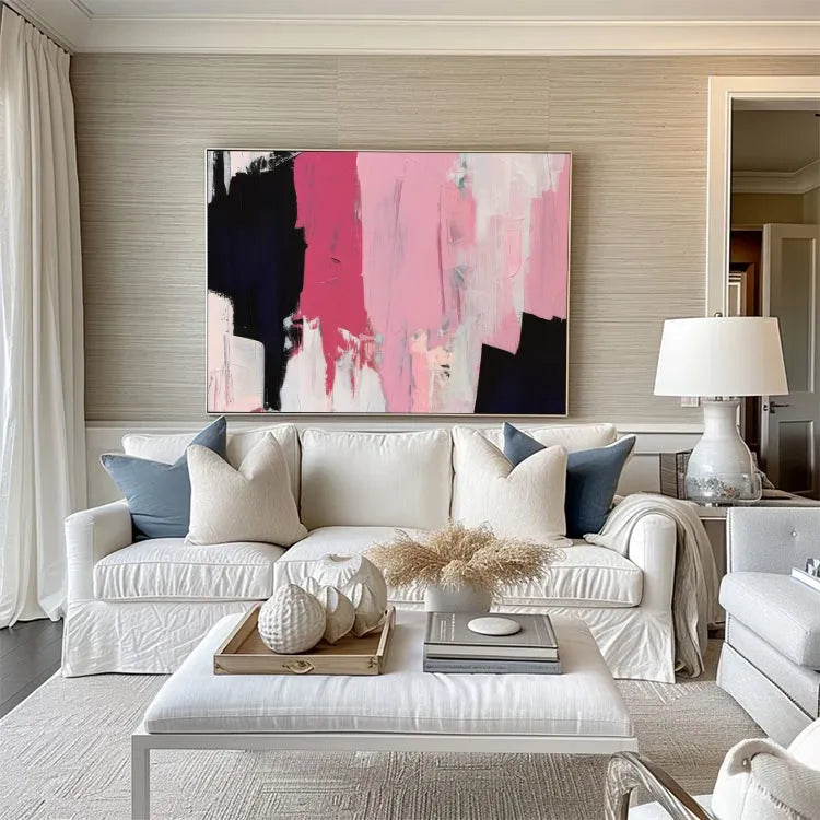 This oil painting exhibits a modern abstract style, characterized by its bold, expressive brushstrokes and vibrant color palette. The composition features a dynamic interplay between deep black, vivid pink, and delicate white, creating a striking visual contrast. The textured brushstrokes suggest a sense of movement and spontaneity, while the layered application of paint adds depth and complexity. The use of color, with its juxtaposition of black and pink, may symbolize the duality of light and darkness, or the tension between passion and calm. The painting's simplicity and the use of limited colors align it with the Abstract Expressionism movement, emphasizing emotional expression over realistic representation.