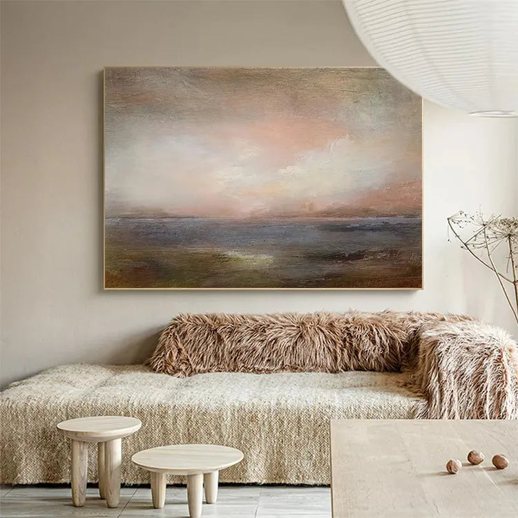 This oil painting presents a serene, ethereal landscape with a subtle gradient of colors transitioning from soft pinks and whites in the upper half to darker, muted browns and blues in the lower half. The brushstrokes are delicate and diffuse, creating a dreamlike, almost misty effect. The use of color and light suggests a tranquil, early morning or late evening sky, with the pink hues symbolizing dawn or dusk. The texture is smooth yet slightly textured, emphasizing the gentle blending of colors. This work aligns with the Impressionist movement, characterized by its emphasis on light and color over detailed representation. The overall composition is minimalist, focusing on the atmospheric quality of the scene rather than specific details.