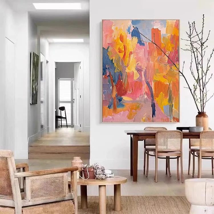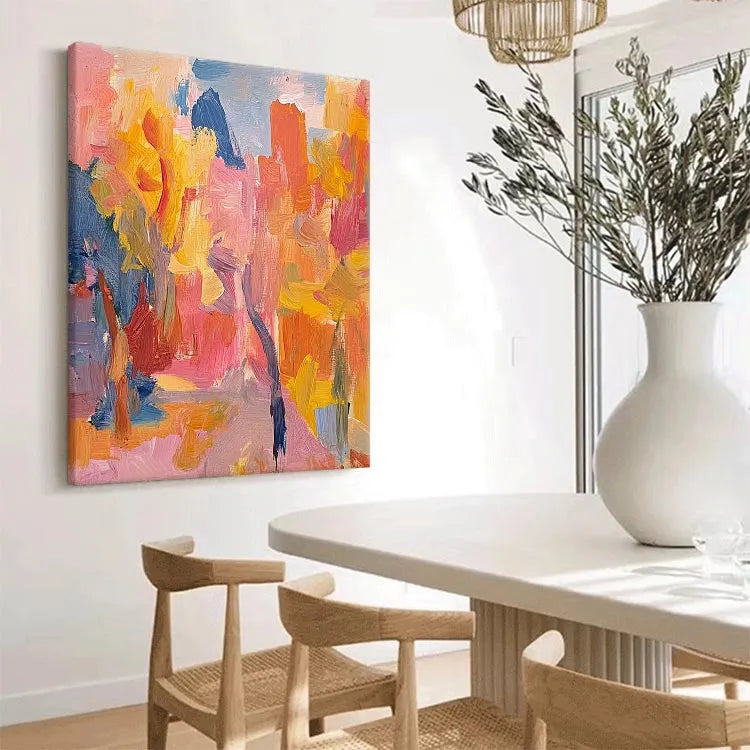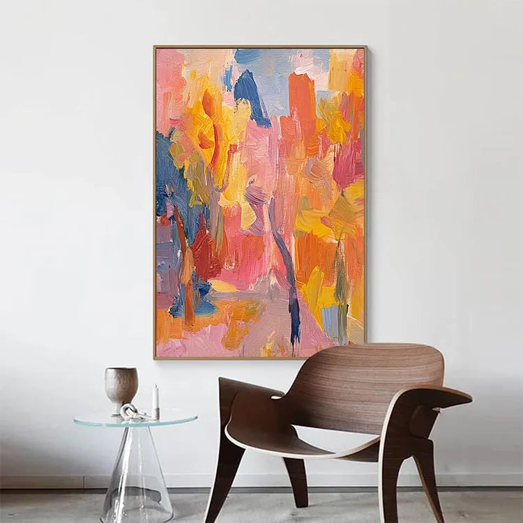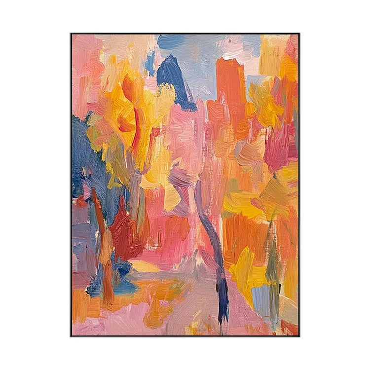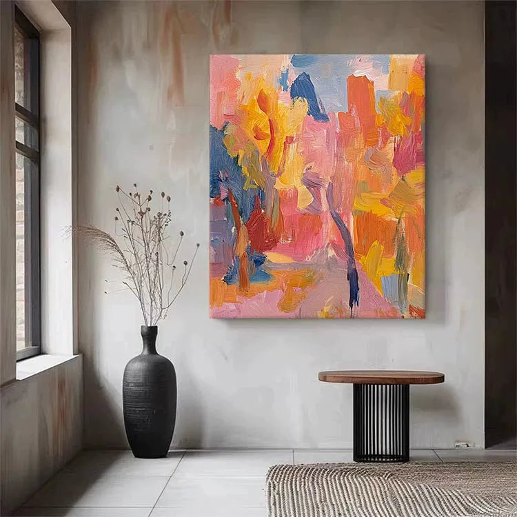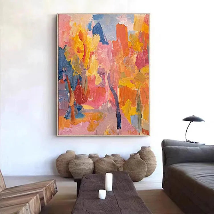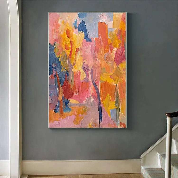 This vibrant abstract painting employs a rich, dynamic palette dominated by warm yellows, oranges, and pinks, contrasted by cooler blues and purples. The thick, textured brushstrokes create a sense of movement and depth, with visible, expressive gestures that suggest a spontaneous application of paint. The composition is non-representational, with no clear focal point, inviting the viewer to explore the interplay of colors and forms. The use of light and shadow is subtle, yet effective, adding a three-dimensional quality to the flat canvas. This work aligns with the Expressionist movement, emphasizing emotional intensity and subjective experience. The rough texture and vivid color choices evoke a sense of energy and spontaneity.