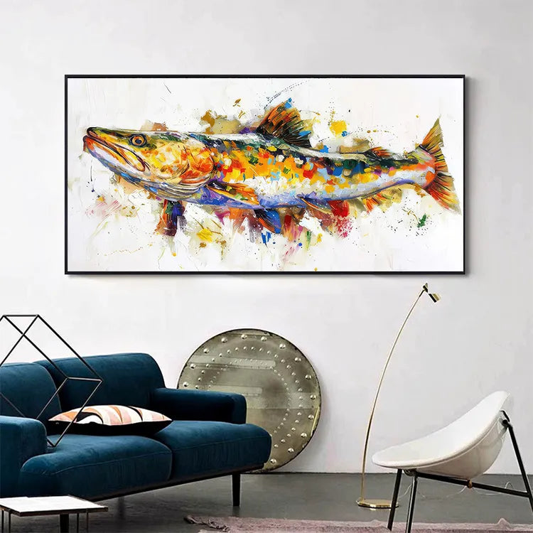The artist employs a splatter technique, where paint is applied in a spontaneous, almost chaotic manner, particularly around the edges of the fish, which adds to the impressionistic feel of the piece. This technique creates a sense of spontaneity and fluidity, as if the fish is caught in motion. The brushstrokes are varied, with some areas featuring smooth, controlled strokes and others exhibiting loose, expressive splatters, contributing to the overall texture and depth of the painting.