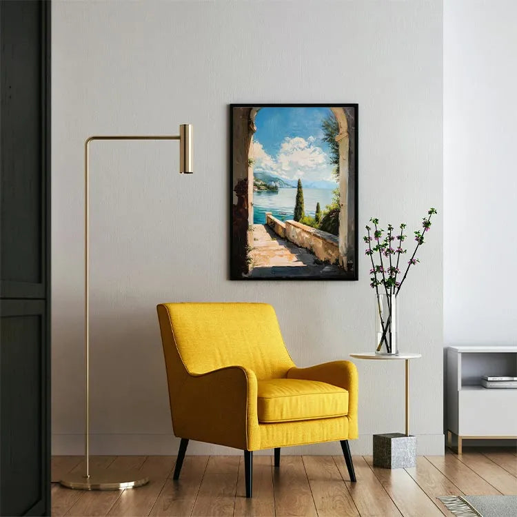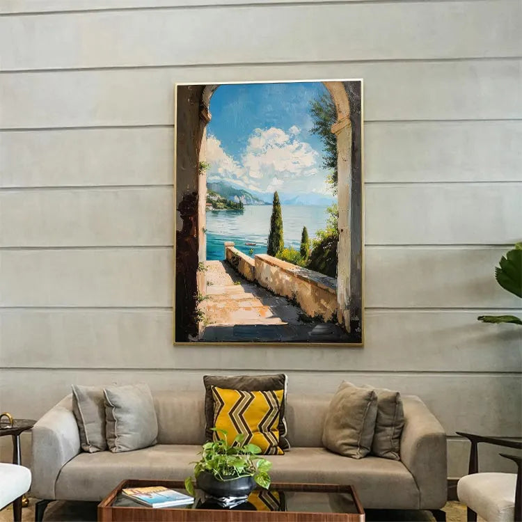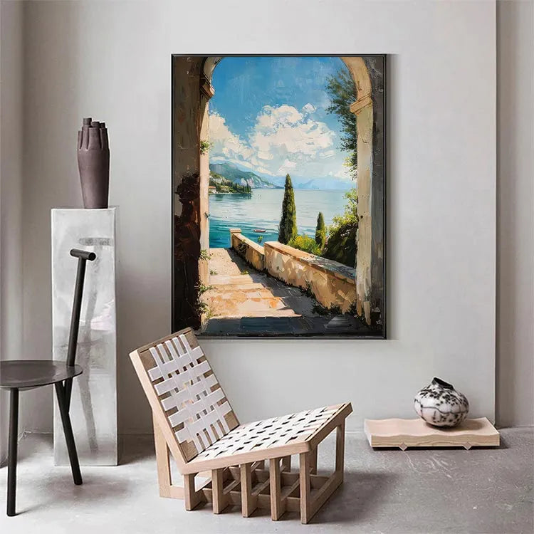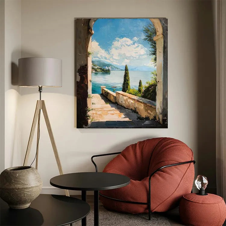 This painting, reminiscent of the Impressionist movement, employs a vibrant color palette dominated by blues and greens, contrasting with the warm, earthy tones of the archway and stone steps. The artist uses thick, textured brushstrokes, particularly in the archway and foliage, to create a sense of depth and realism. The composition is balanced, with the archway framing the serene, expansive landscape and the distant, misty mountains. Light is masterfully used to highlight the texture of the stone and the lushness of the greenery, while the sky's fluffy clouds add a sense of tranquility. The painting's style combines realism with a touch of romanticism, evoking a peaceful, contemplative mood.