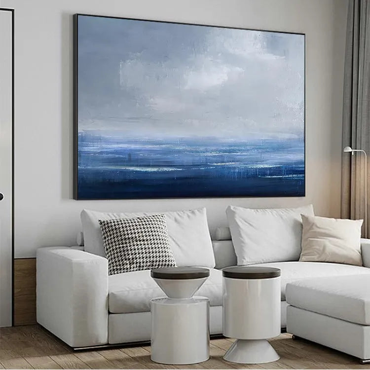 This oil painting exemplifies a minimalist approach, characterized by its restrained color palette and subtle gradations. The composition is dominated by cool blues and grays, creating a serene, almost ethereal seascape. The upper portion of the painting features a textured, cloud-like sky, with visible brushstrokes adding a sense of depth and movement. The lower section transitions into a darker blue, suggesting the ocean, with faint, horizontal brushstrokes indicating the water's surface. The use of light is subtle, with a gentle gradient from the sky to the sea, enhancing the tranquil mood. This work aligns with the principles of the modernist movement, focusing on simplicity, emotion, and the interplay between color and texture. The painting's texture, achieved through visible brushwork, adds a tactile quality, enriching the visual experience.