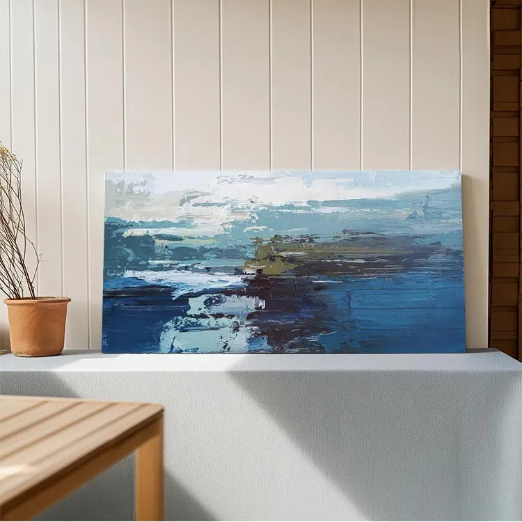This oil painting employs an abstract style, characterized by its loose, expressive brushstrokes and textured application. The composition features a dynamic interplay between cool and warm colors, with dominant blues and greens contrasting against muted earth tones and white highlights. The use of color suggests a reflection or mirroring effect, creating a sense of depth and movement. The textured brushstrokes add a tactile quality, enhancing the visual richness. The light application appears spontaneous, contributing to the painting's overall sense of spontaneity and fluidity. This work aligns with the Abstract Expressionist movement, emphasizing emotion and process over realism. The artist's technique evokes a sense of nature's ephemeral beauty, captured in a moment of dynamic equilibrium.