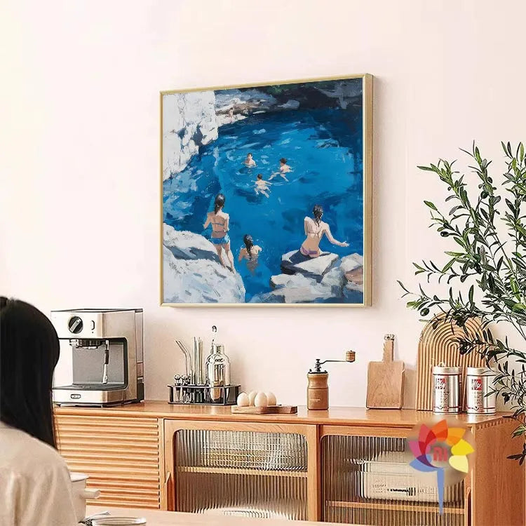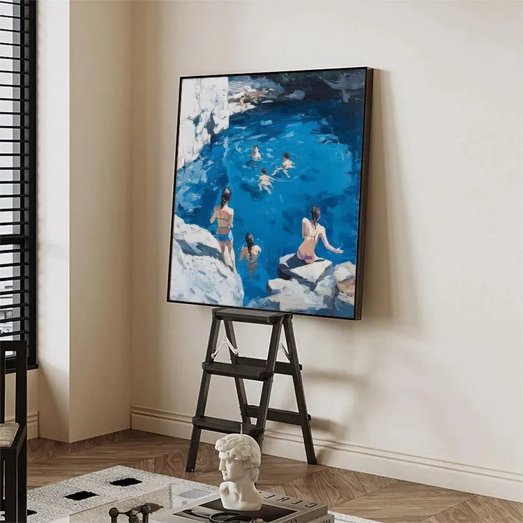 This painting, likely belonging to the Realism movement, showcases a group of five young women in a natural, rocky pool of vivid blue water. The composition is balanced, with the women's bodies creating dynamic lines that draw the viewer's eye across the scene. The artist employs a realistic style, characterized by detailed, textured brushstrokes that capture the naturalism of the setting. The use of color is striking, with the deep blue of the water contrasting against the white and gray rocks, and the varied skin tones and swimsuits adding subtle diversity. Light is skillfully rendered, highlighting the women's forms and the water's reflective quality. The painting's texture is slightly rough, with visible brushstrokes adding a sense of immediacy and spontaneity. The overall effect is one of serene, natural beauty, emphasizing the human experience in nature.