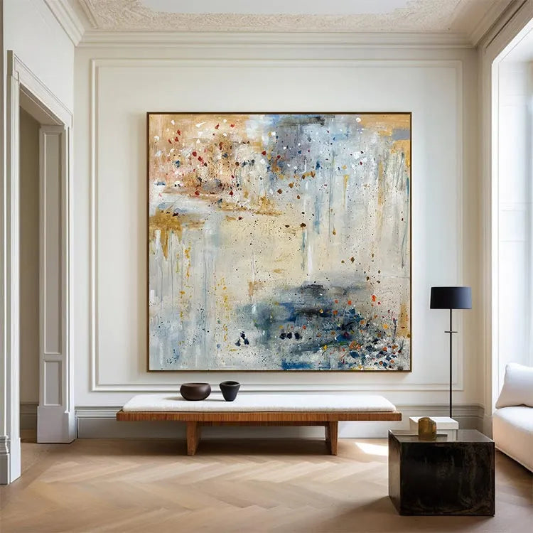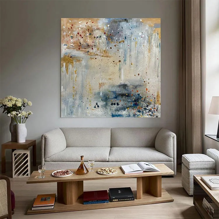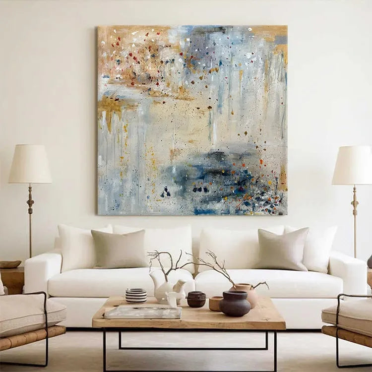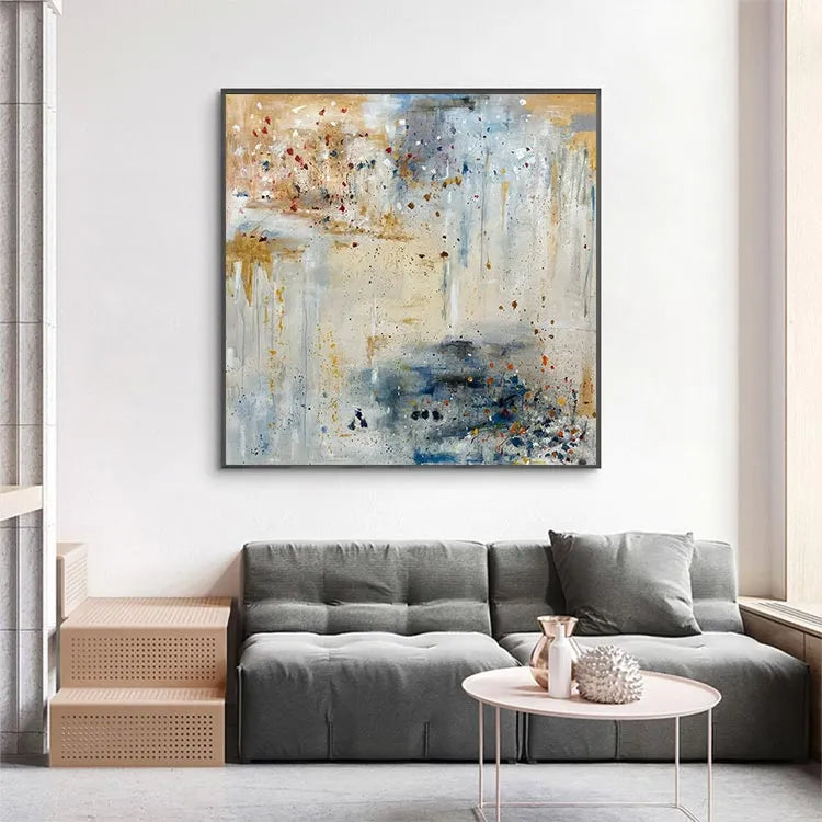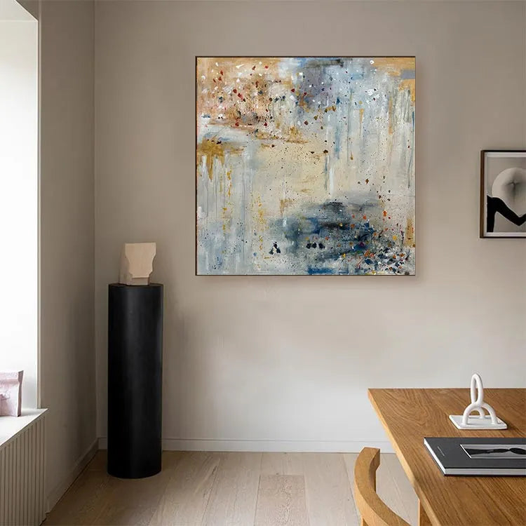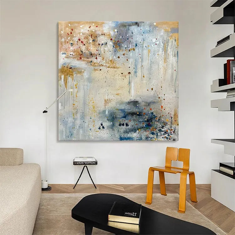 This abstract painting employs a dynamic interplay of color and texture, evoking a sense of spontaneity and movement. The composition features a complex, layered palette of muted earth tones—beige, blue, and gray—interspersed with vivid splashes of red and yellow. The use of thick, textured brushstrokes creates a tactile quality, while the splatter technique adds a sense of chaotic energy. The light, diffuse application of color suggests an atmospheric depth, reminiscent of Abstract Expressionism. The blend of opaque and transparent layers enhances the visual complexity, inviting the viewer to explore the interplay between color and form. The overall effect is both meditative and dynamic, capturing the essence of spontaneous creativity.