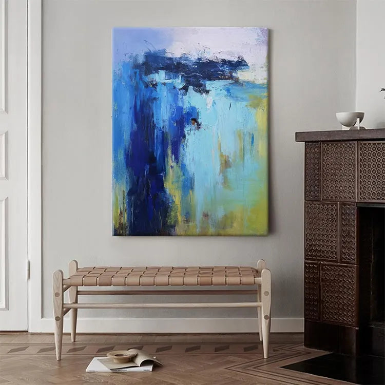 This oil painting showcases an abstract composition characterized by dynamic brushstrokes and a vibrant color palette. The dominant hues of blue, teal, and yellow create a harmonious yet contrasting interplay, evoking a sense of movement and depth. The thick, textured brushstrokes suggest a spontaneous and expressive approach, reminiscent of the Abstract Expressionism movement. The use of light and dark contrasts, particularly in the upper and lower sections, adds a sense of layering and complexity. The subtle blending of colors in the midsection introduces a sense of calm amidst the chaos, while the rough textures convey a tactile quality. Overall, the painting balances spontaneity with a structured composition, inviting viewers to explore its emotional and visual resonance.