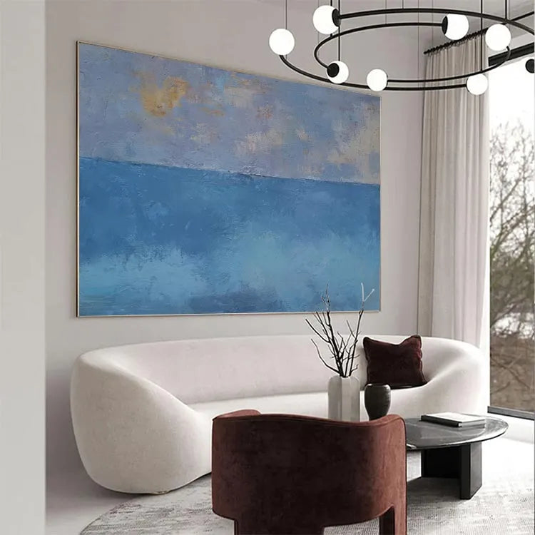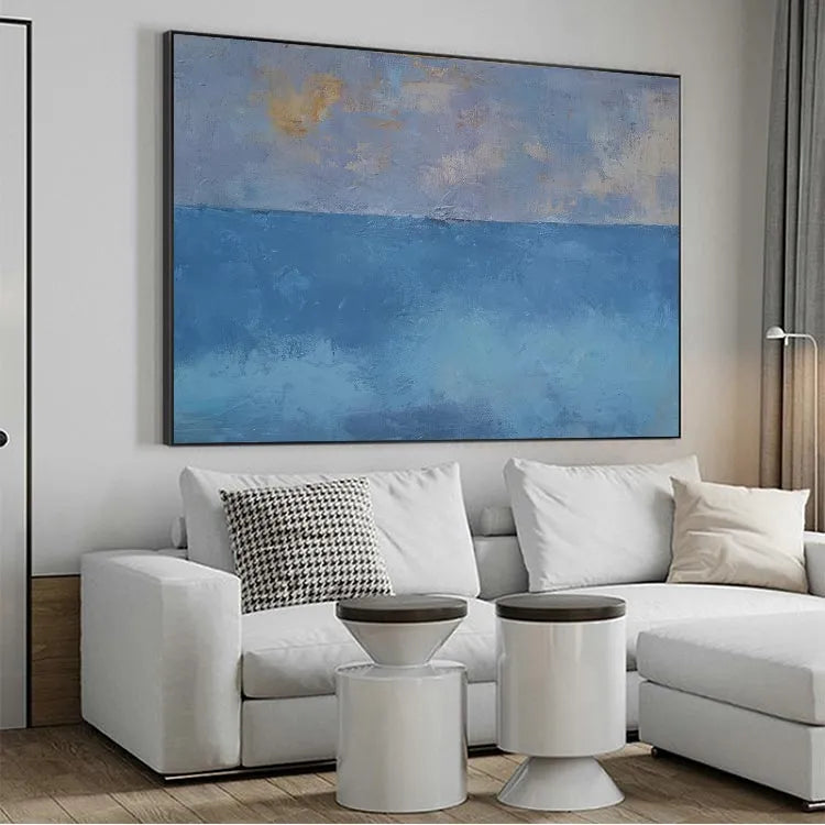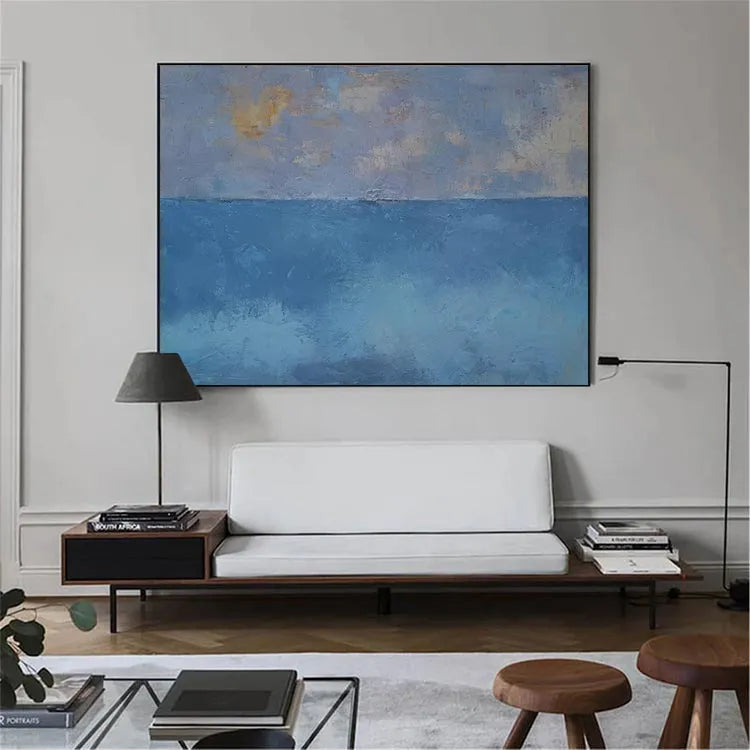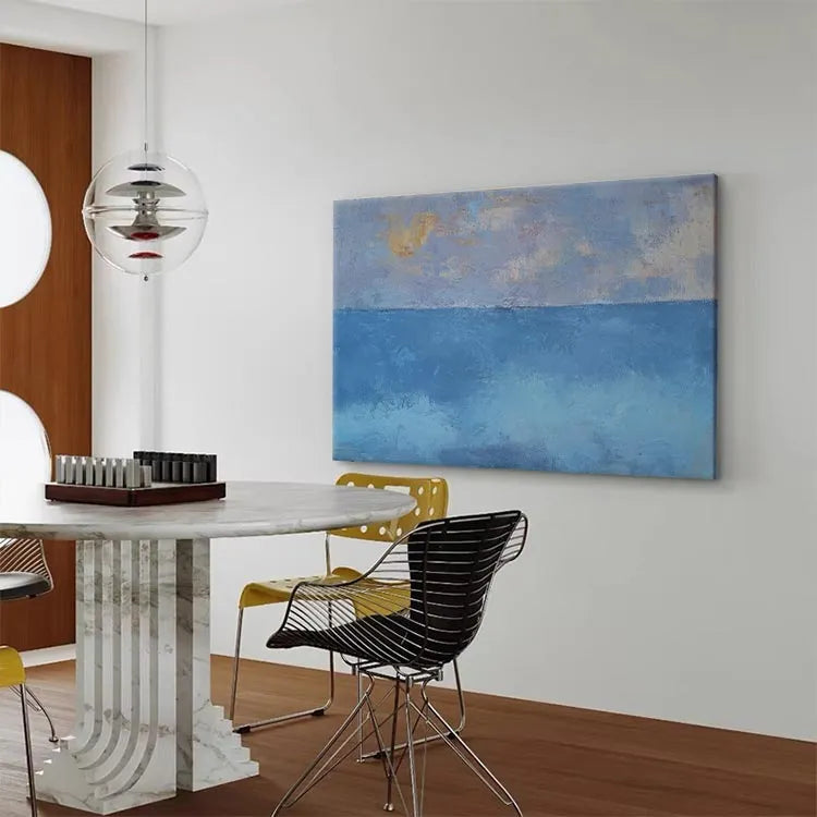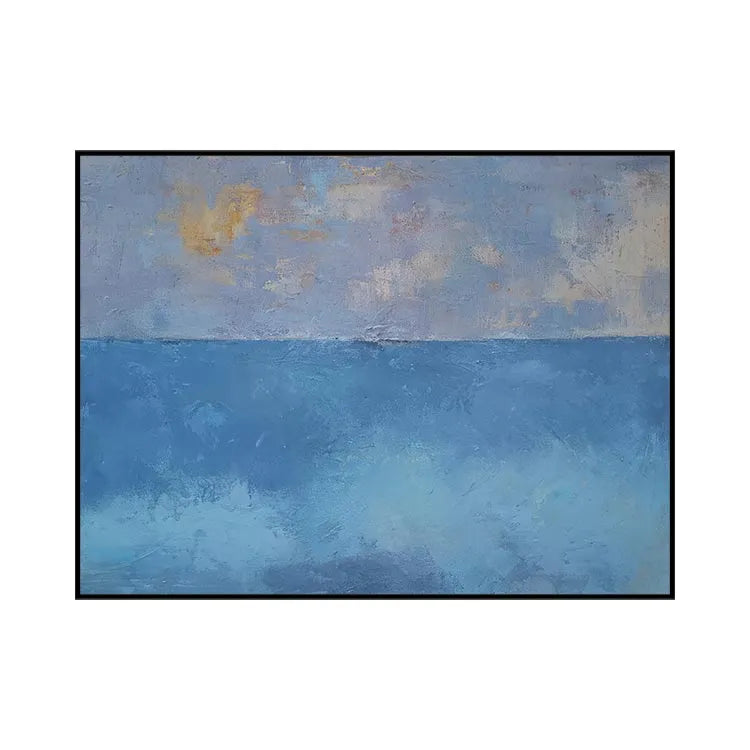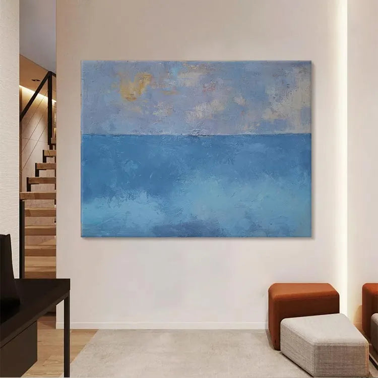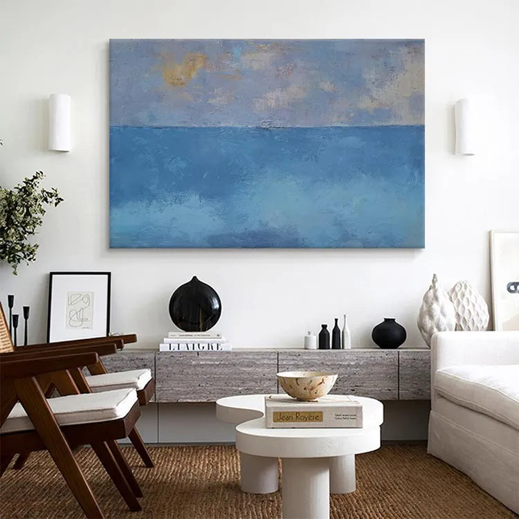 This oil painting exhibits a minimalist approach, characterized by its simplicity and the use of limited color palette. The composition divides the canvas horizontally into two distinct sections: the upper part features a subtle gradient of pale blue, lavender, and hints of yellow, suggesting an ethereal sky; the lower part transitions into a deeper, more saturated blue, evoking the ocean. The textures are evident in the visible brushstrokes, adding a tactile quality to the smooth, yet slightly rough, surface. The interplay between the soft, diffused light and the darker, more opaque areas creates a sense of depth and tranquility. This work aligns with the principles of the modernist movement, emphasizing the beauty of simplicity and the emotional resonance of color. The overall effect is calming, with a quiet, contemplative mood.