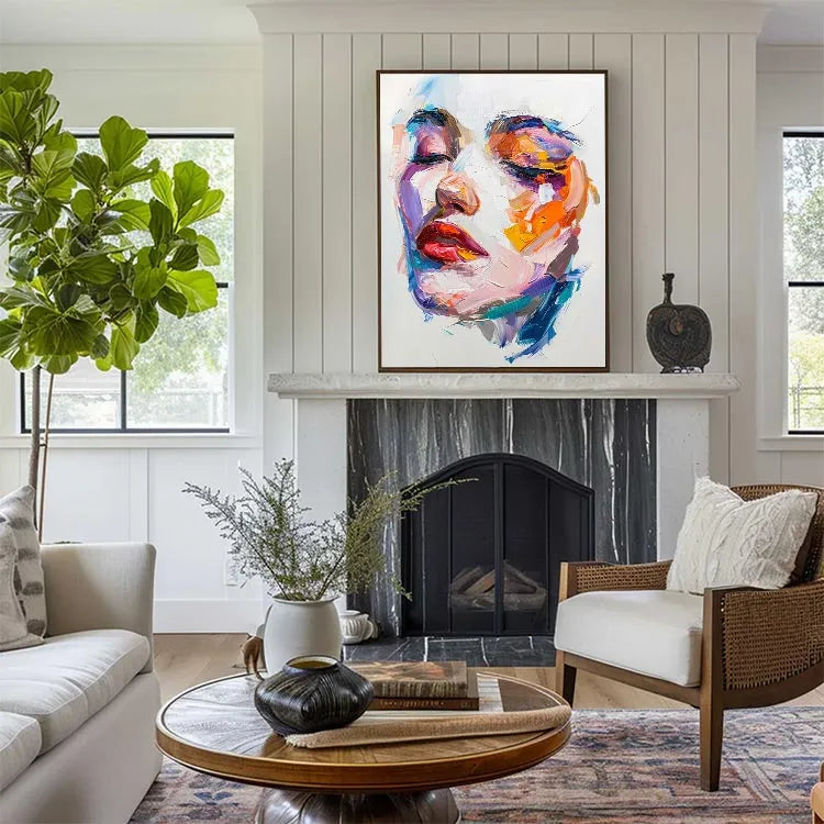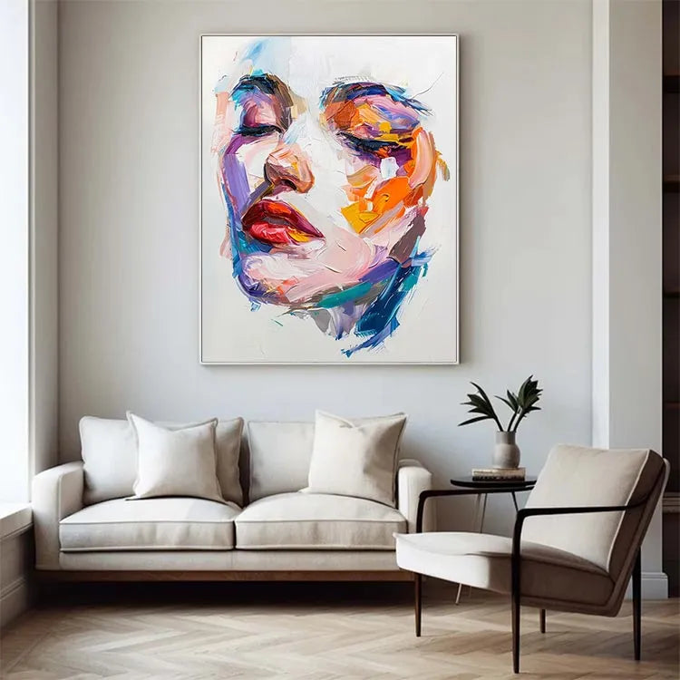 This painting, characterized by its vibrant and expressive use of color, exemplifies the qualities of Abstract Expressionism. The artist employs thick, dynamic brushstrokes that create a sense of movement and emotional intensity. The face, depicted in a non-representational style, is a collage of vivid hues—reds, purples, blues, and oranges—interspersed with white, which contrasts sharply and draws the viewer's eye. The lack of detailed features focuses attention on the emotional essence rather than physical likeness. The texture of the paint is evident, with visible brushstrokes adding a tactile quality to the painting. The interplay of color and texture suggests a vibrant inner life, symbolizing the complexity of human emotion. The overall composition is balanced yet dynamic, inviting the viewer to interpret the emotional state conveyed by the abstract face.