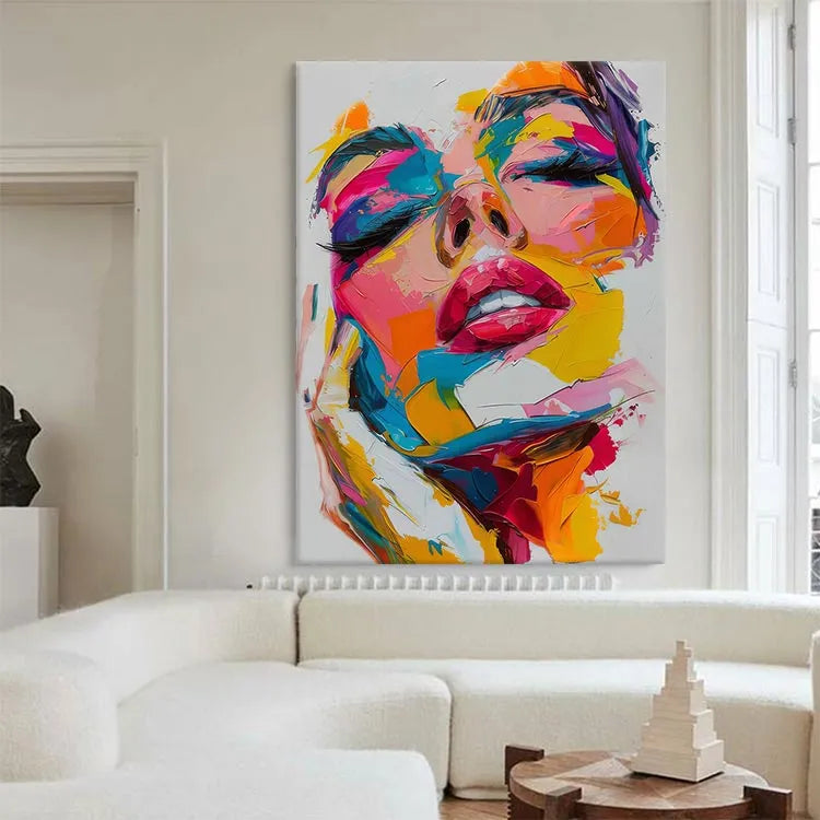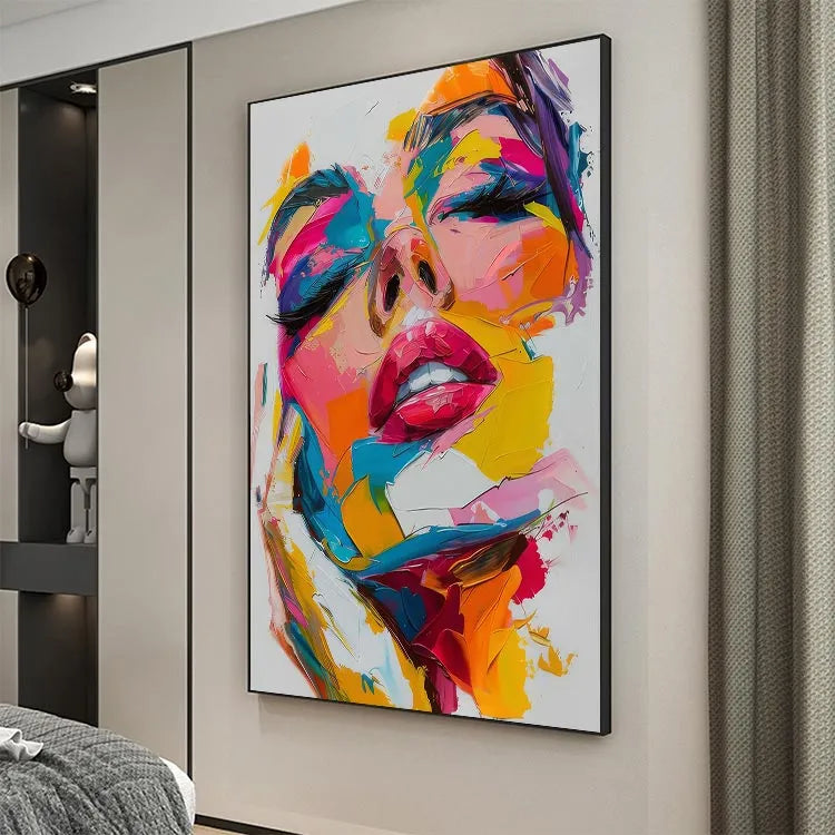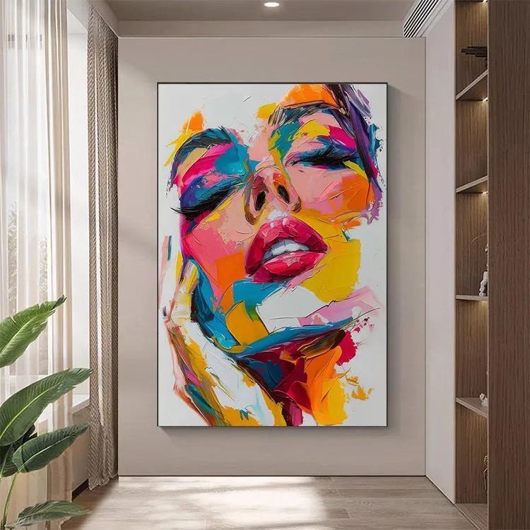 This vibrant, abstract portrait employs a vivid, chaotic palette dominated by neon pinks, blues, yellows, and oranges. The brushstrokes are thick and expressive, creating a textured, almost three-dimensional effect. The artist's use of color and light suggests influences from Pop Art, while the abstract nature and emphasis on facial features hint at Expressionism. The face, with its closed eyes and slightly parted lips, evokes a sense of introspection or emotional depth. The juxtaposition of bright, contrasting colors against the white background adds a dynamic, almost surreal quality, enhancing the painting's emotional impact. The bold, energetic composition and the fragmented, yet cohesive, application of color define this work as a contemporary, abstract expressionist piece.