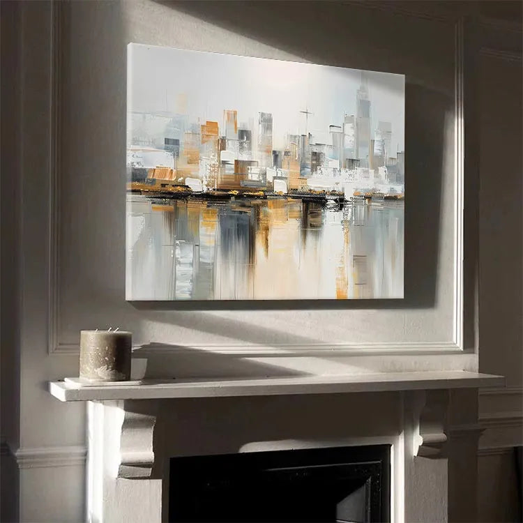 This oil painting is a contemporary abstract painting that utilizes a muted color palette of grays, whites, and warm yellows. The composition features a cityscape reflected in a water body, creating a sense of symmetry and tranquility. The brushstrokes are fluid yet deliberate, with visible textures that add depth and movement. The use of light and reflection is masterful, with the yellow and gray hues suggesting a serene, early morning or late afternoon light. The abstract style and minimalist approach suggest influences from the modernist movement, while the reflective water adds a touch of romanticism. The overall effect is a harmonious blend of urban and natural elements, evoking a peaceful coexistence.