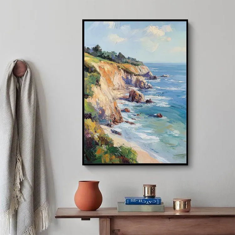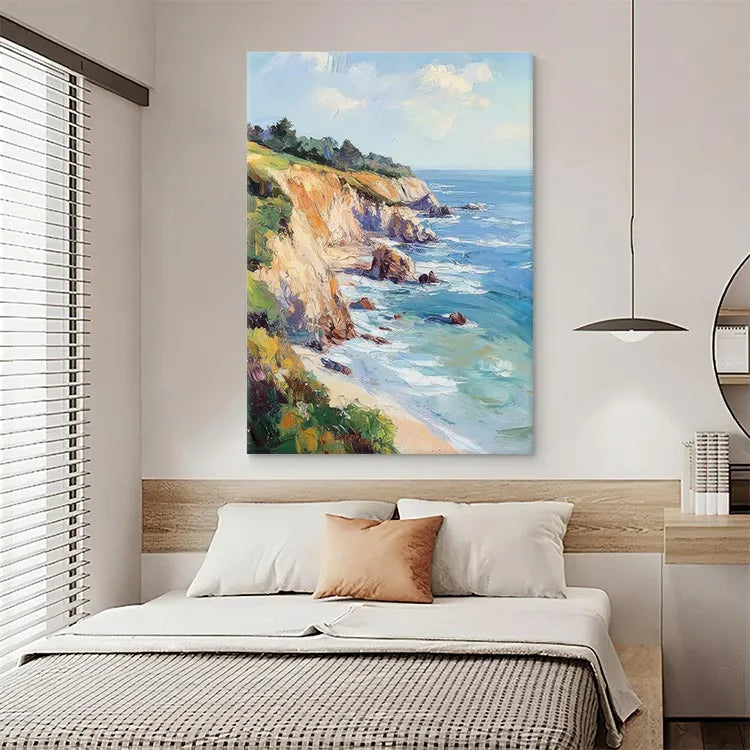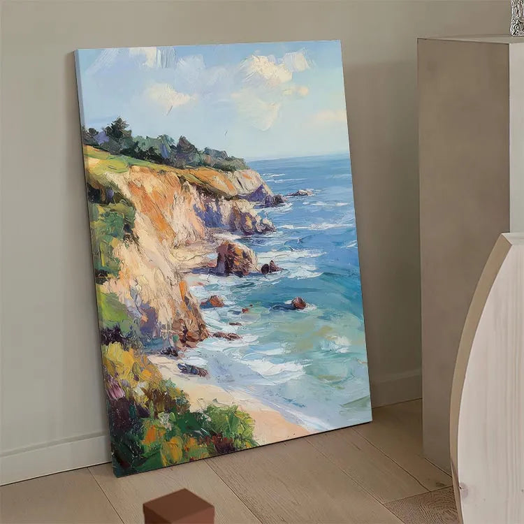 This painting, likely belonging to the Impressionist movement, showcases a coastal landscape with vivid, expressive brushstrokes. The composition leads the eye along the cliffside, emphasizing the dynamic interaction between land and sea. The artist employs a vibrant color palette, with blues and greens in the ocean contrasting against the warm earth tones of the cliffs. Light and shadow are skillfully manipulated, creating a sense of depth and movement. The textured brushstrokes add a sense of spontaneity and energy, characteristic of Impressionism. The use of light suggests a sunny day, enhancing the vibrant, almost joyful atmosphere. This work effectively captures the transient beauty of nature through its lively, fluid style.