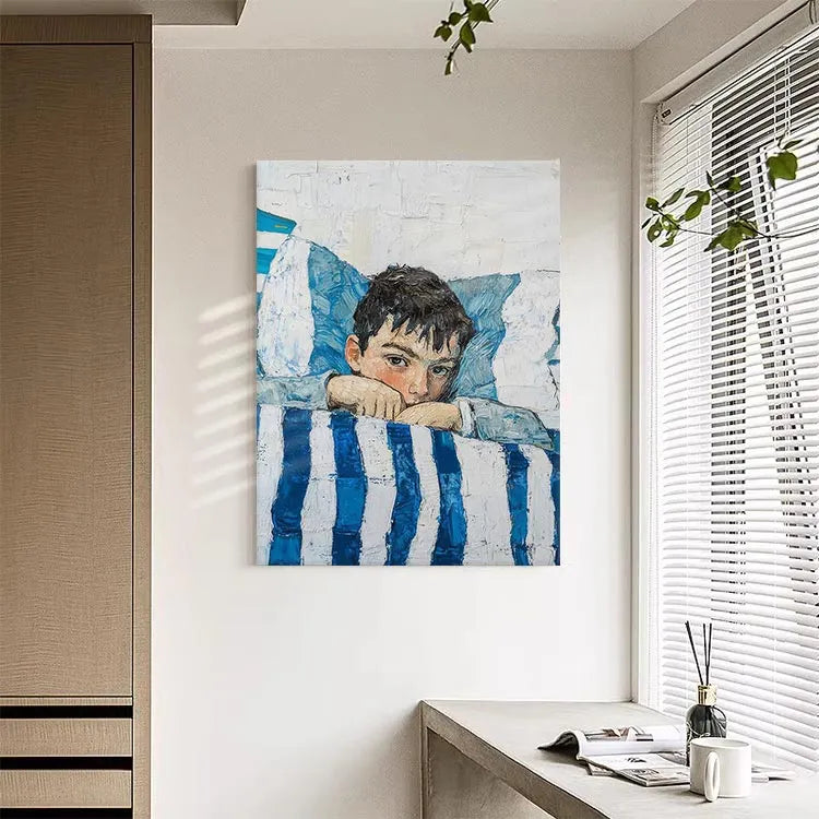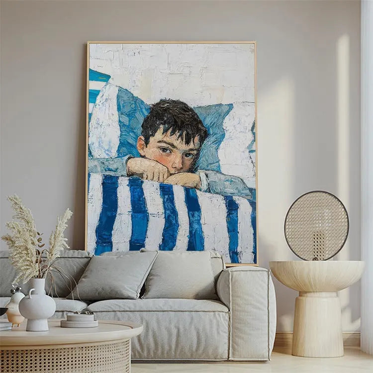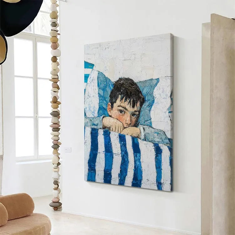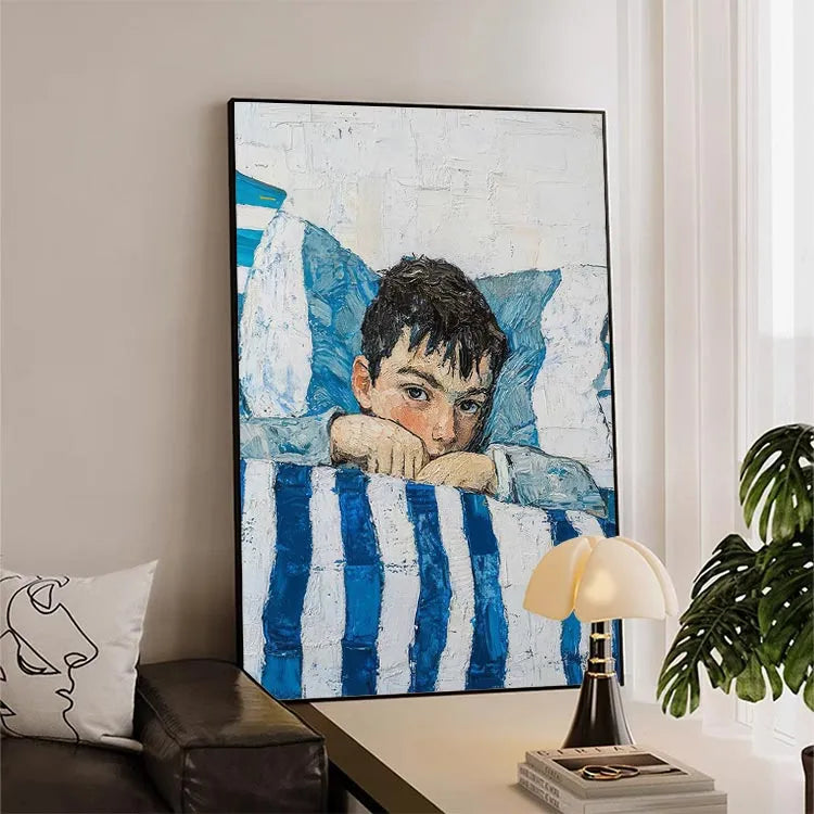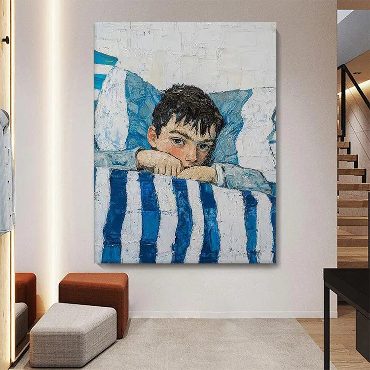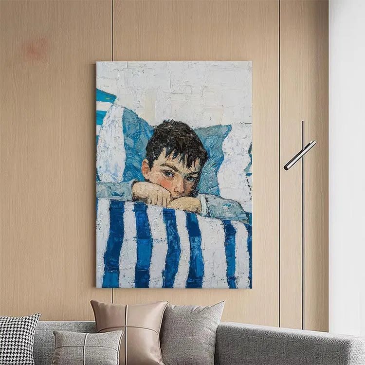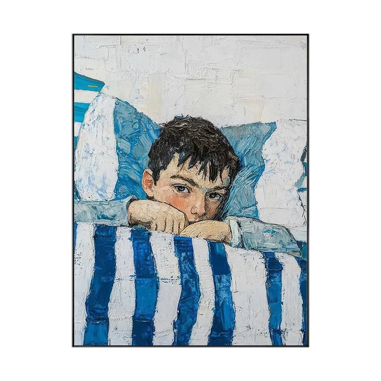 This painting, likely belonging to the Realism or Impressionism movements, features a young boy with a contemplative expression, partially hidden under a striped blue and white blanket. The artist employs thick, textured brushstrokes, creating a tactile quality in the fabric and skin. The use of color is restrained yet effective, with the cool blues and whites evoking a sense of calm and introspection. The boy's dark, slightly messy hair contrasts with the lighter tones, drawing attention to his face. The light source is subtle, emphasizing the natural, unadorned beauty of the subject. The composition centers the boy, inviting the viewer to reflect on his introspective mood.