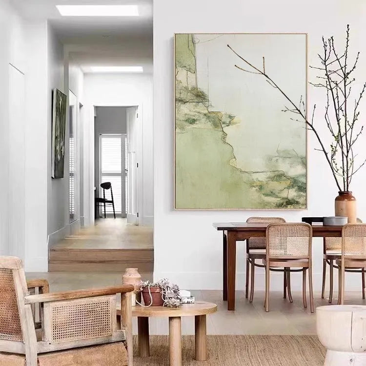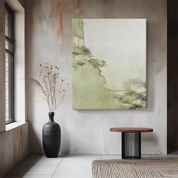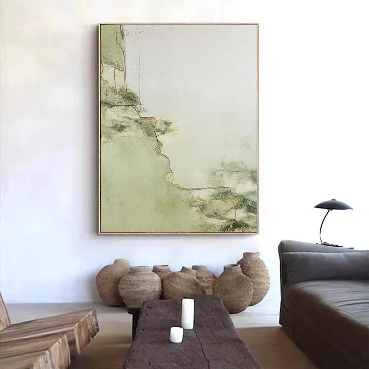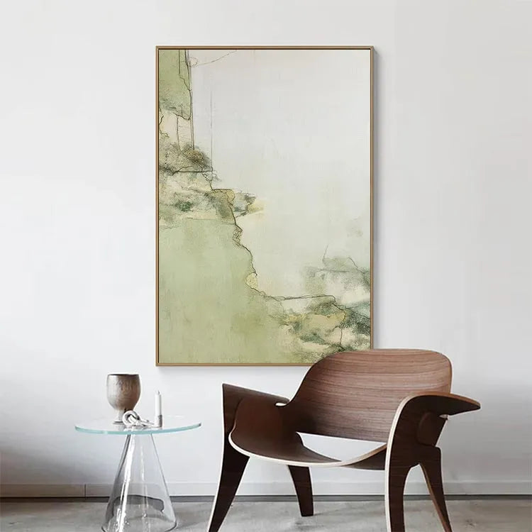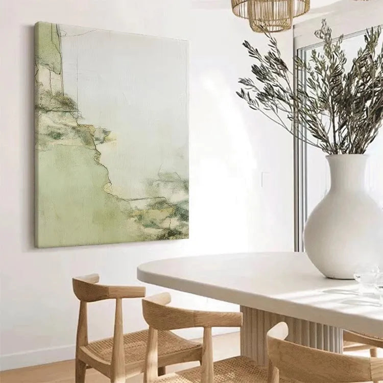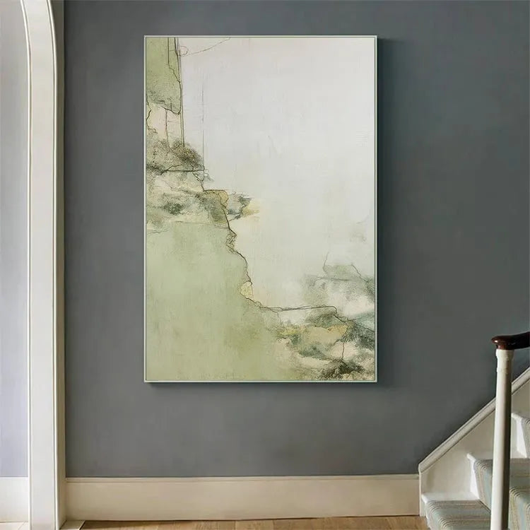 This painting exemplifies the delicate, ethereal qualities of watercolor, with its subtle interplay of light and shadow. The composition is characterized by a vertical division, with the left side featuring a textured, greenish landscape that gradually fades into a misty, white background on the right. The use of color is restrained, with soft greens and grays creating a serene, almost dreamlike atmosphere. The texture of the paper is visible, adding a tactile quality to the piece. The brushstrokes are gentle and fluid, with a loose, almost sketch-like quality that suggests spontaneity. This work may belong to the modern minimalist movement, emphasizing simplicity and the natural beauty of understated forms and colors.
