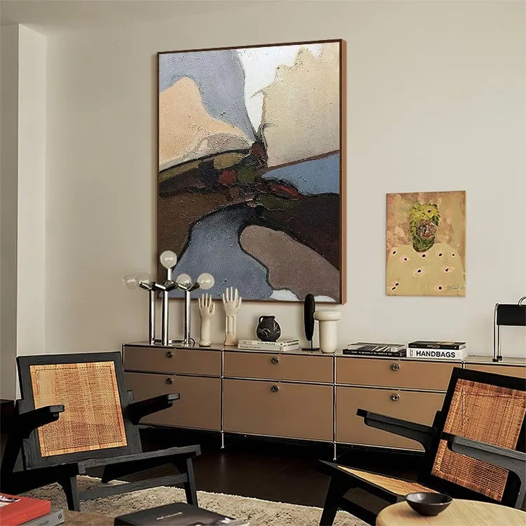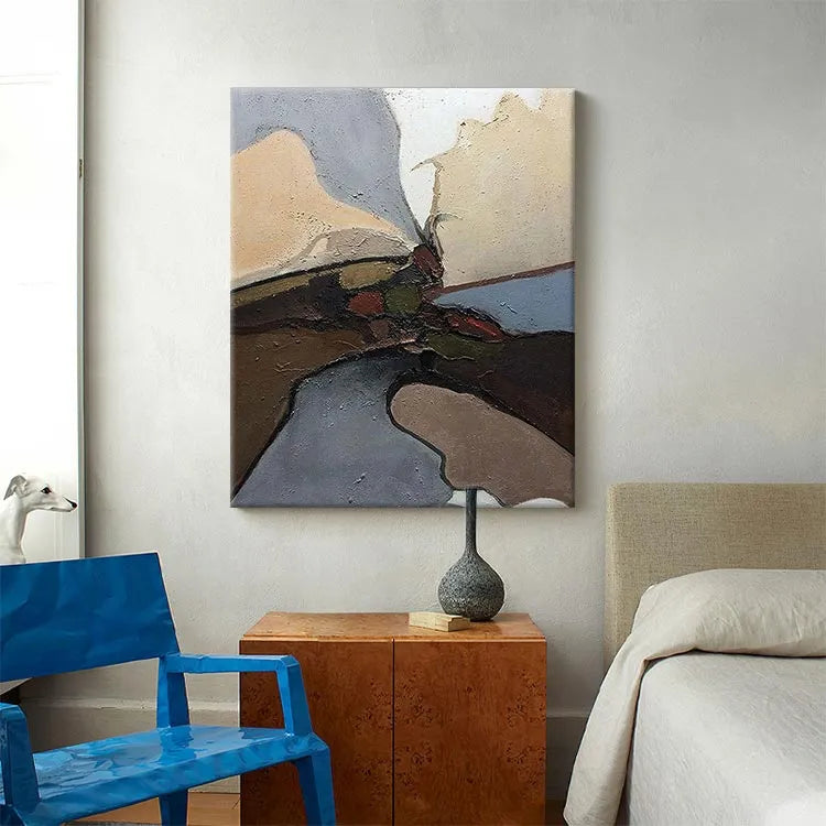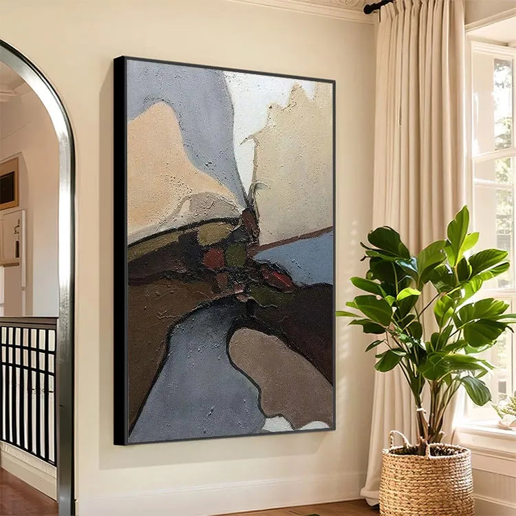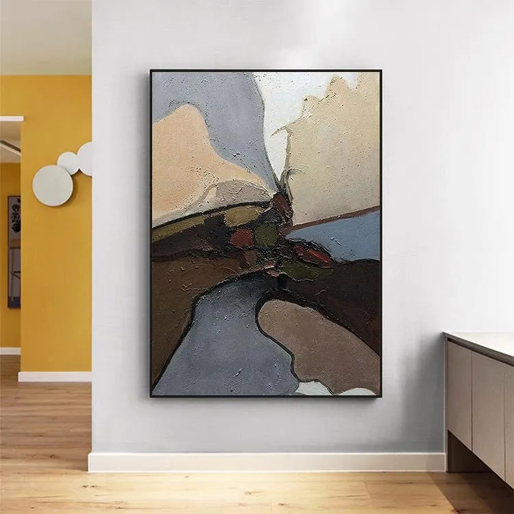 This abstract oil painting showcases a textured, layered composition with a focus on earthy and muted colors—beige, brown, grey, and red—creating a sense of depth and movement. The thick, textured brushstrokes add a tactile quality, while the dark, almost black lines intersect and divide the space, suggesting a central focal point. The use of color and texture evokes a natural, organic landscape. The subtle gradations and the interplay of light and shadow hint at the influence of Abstract Expressionism. The composition's asymmetrical balance and the emphasis on texture and form suggest a contemplative, introspective mood.