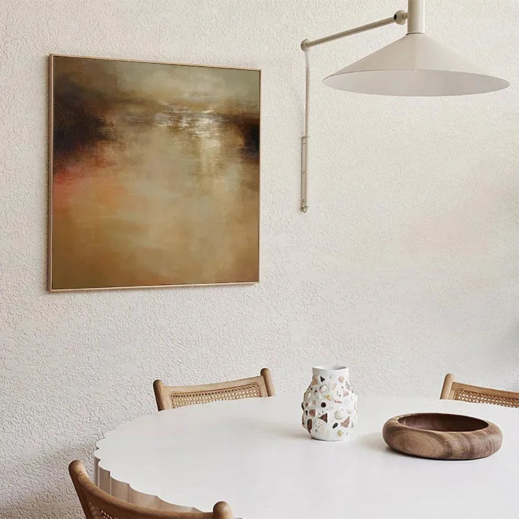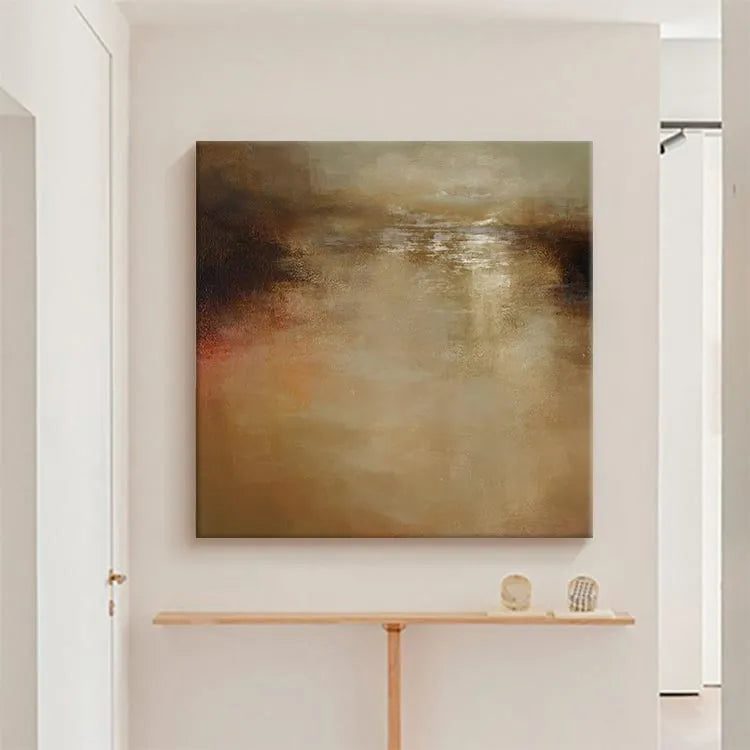 This oil painting exemplifies the Abstract Expressionism movement, characterized by its spontaneous and gestural brushwork. The composition features a horizontal band of warm, earthy browns and oranges, juxtaposed against a softer, lighter palette of whites, creams, and subtle grays. The brushstrokes are loose and fluid, creating a sense of movement and depth. The use of color suggests a contrast between the solidity of the earthy tones and the ethereal, almost mist-like quality of the lighter areas. The texture is visibly rough, with visible brushstrokes adding a tactile quality to the piece. The overall effect is one of dynamic balance, evoking a sense of natural landscape or atmospheric phenomenon.