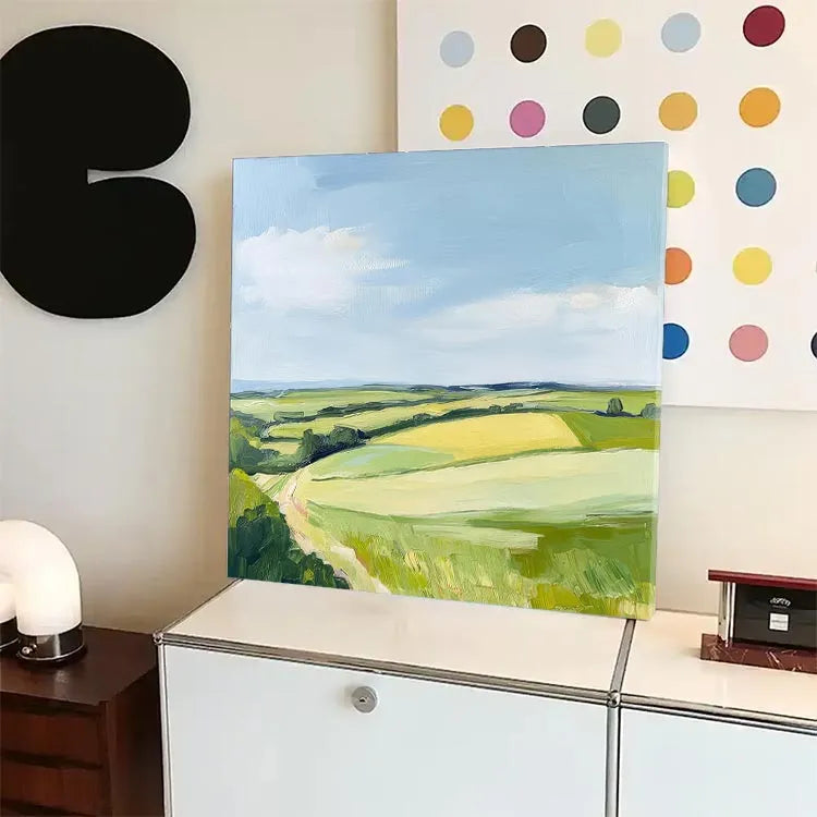 This oil painting exemplifies a serene landscape, utilizing a loose, impressionistic style with visible brushstrokes that add texture and movement to the scene. The composition employs a gentle, rolling terrain that guides the viewer's eye from the foreground to the horizon, where the land meets a softly clouded sky. The color palette is dominated by various greens and yellows, suggesting a lush, fertile countryside in spring or summer. The use of light is subtle, with soft gradients that enhance the sense of depth and distance. The brushstrokes are broad and expressive, creating a sense of spontaneity and immediacy. This work may be associated with the Impressionist movement, characterized by its emphasis on light and natural beauty.