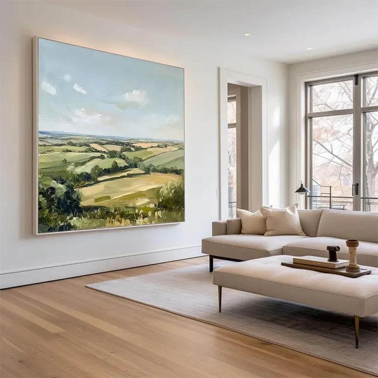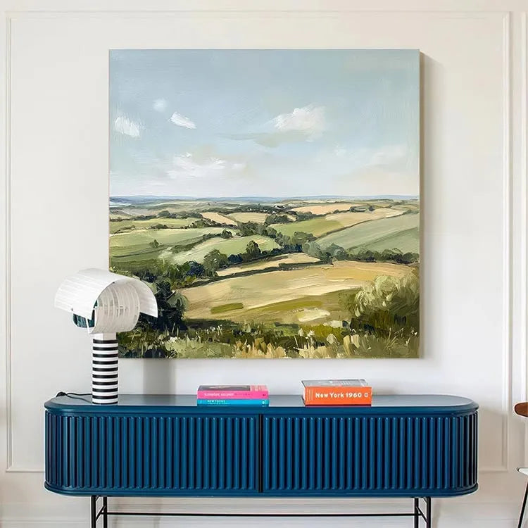 This painting, likely belonging to the landscape tradition, exhibits a serene and expansive rural scene. The composition employs a gentle, rolling terrain, with undulating hills and fields that draw the viewer's eye toward the horizon. The use of color is subtle yet effective, with a palette dominated by greens, yellows, and blues, creating a harmonious and tranquil atmosphere. The light is diffused, suggesting a clear, sunny day, while the soft, almost impressionistic brushstrokes add a sense of movement and texture to the landscape. The artist's technique, with visible, yet controlled, strokes, suggests influence from the Impressionist movement, focusing on light and color rather than detailed realism. The overall effect is one of calm and beauty, inviting contemplation of the natural world.