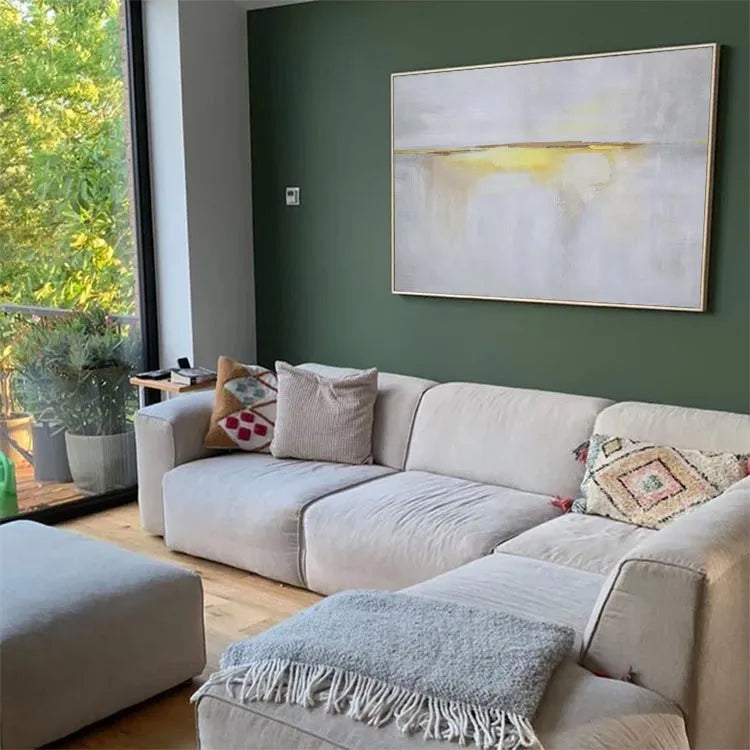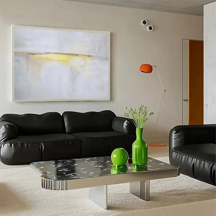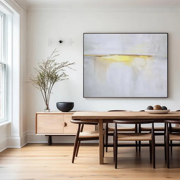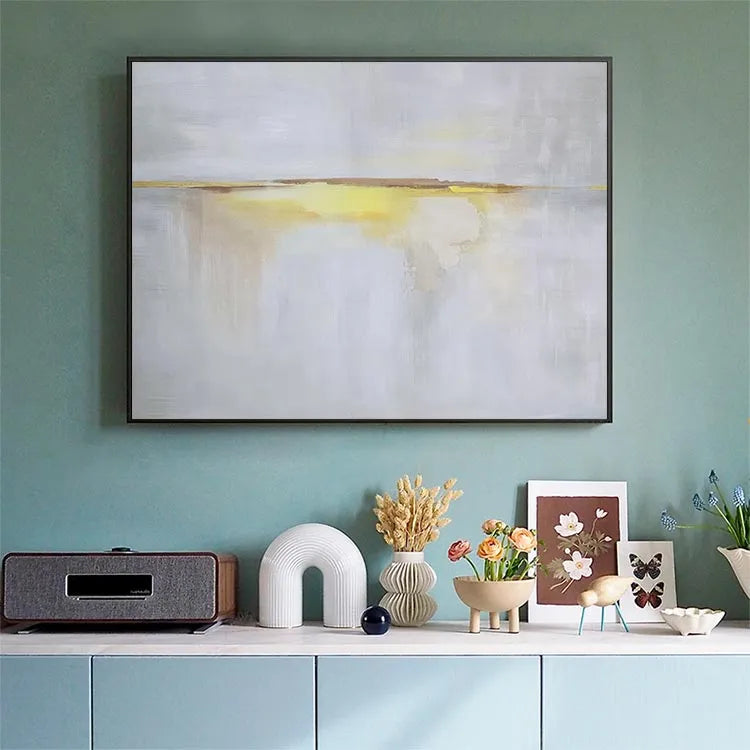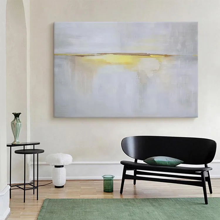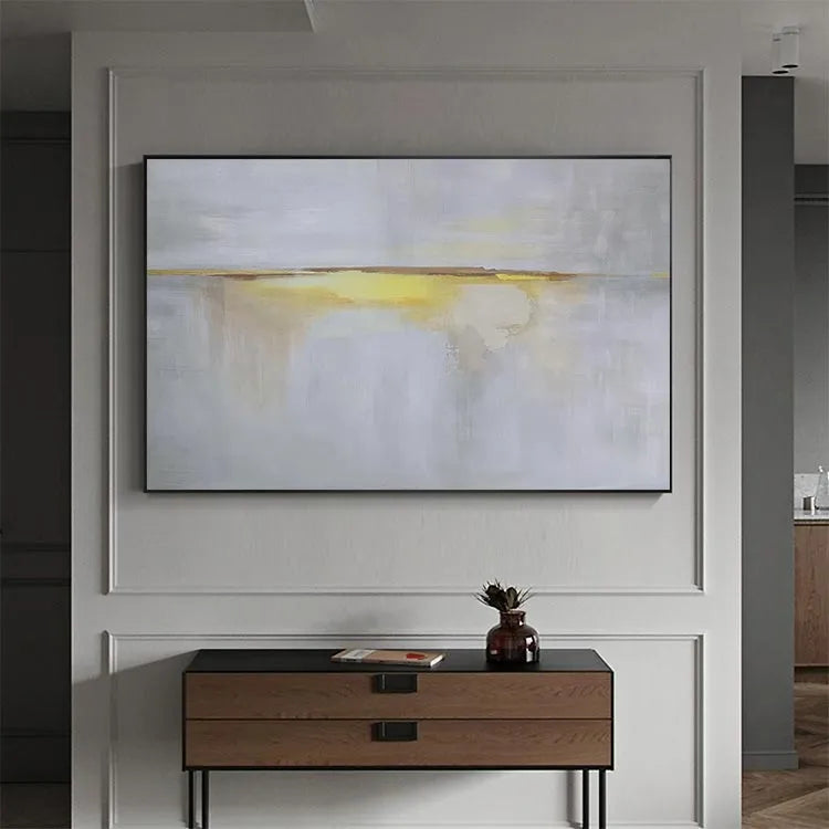 This oil painting employs a minimalist style, characterized by its restrained palette and abstract composition. The horizontal yellow band, situated slightly above the center, creates a stark contrast against the predominantly white and gray background. The use of color is subtle yet effective, evoking a sense of light and reflection. The brushstrokes are loose and textured, adding depth and movement to the otherwise calm surface. The interplay of light and shadow suggests a reflection or a subtle landscape, aligning with the principles of modern abstract art. The overall composition is balanced and serene, inviting the viewer to contemplate the simplicity and elegance of the visual experience.