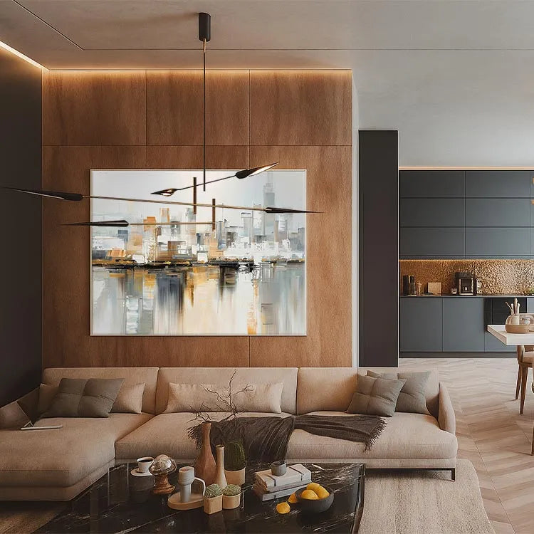 This painting is a contemporary abstract work, exhibits a modern urban landscape. The composition features a cityscape reflected in a water body, with buildings rendered in a minimalist, almost geometric style. The use of color is subtle yet effective, with a palette dominated by muted browns, grays, and whites, interspersed with golden yellows, suggesting a tranquil yet industrial atmosphere. The brushstrokes are loose and textured, creating a sense of movement and reflection. The light is diffuse, with a soft glow suggesting either dawn or dusk. The digital effects and layering of colors suggest a blend of traditional and digital painting techniques. This work aligns with the Abstract Expressionism movement, emphasizing emotion and the subconscious.