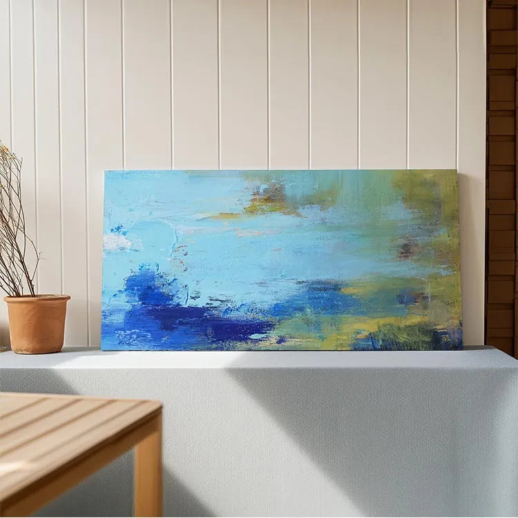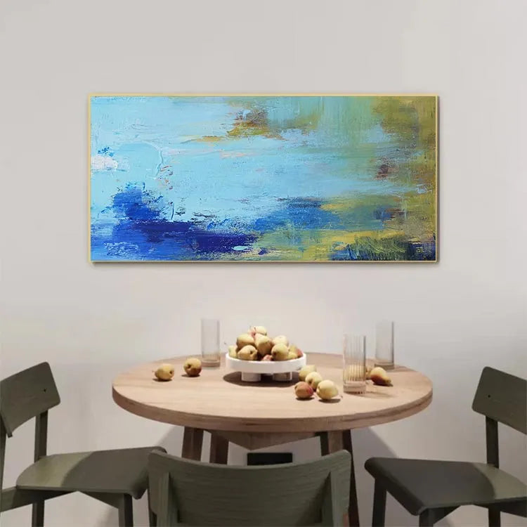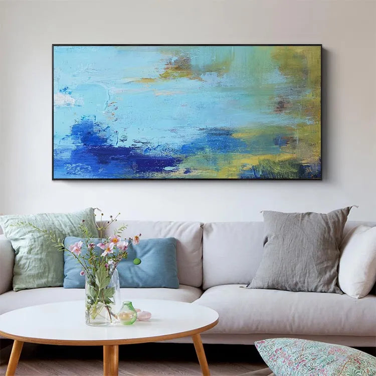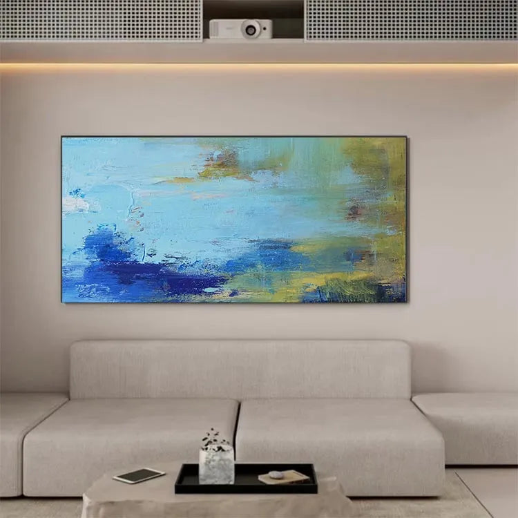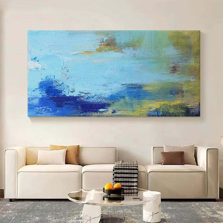 This oil painting exhibits an abstract style, characterized by its fluid, layered application of color and texture. The composition features a harmonious blend of cool and warm hues, with dominant shades of blue, green, and yellow. The brushwork is visible, with thick, textured strokes creating a sense of depth and movement. The light blue and green areas suggest a serene, airy atmosphere, while the darker blue and yellow patches introduce contrast and complexity. The interplay of light and shadow is subtle yet effective, with the lighter areas appearing almost translucent, overlaying the denser, more opaque sections. This work may belong to the Abstract Expressionism movement, emphasizing emotional expression through spontaneous and intuitive techniques. The overall effect is both calming and dynamic, inviting the viewer to explore its subtle symbolism and textures.