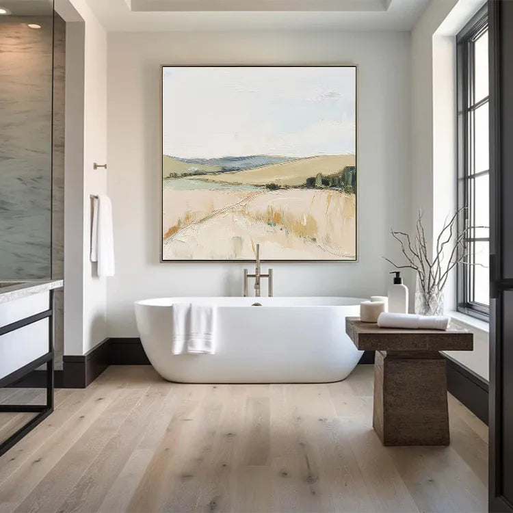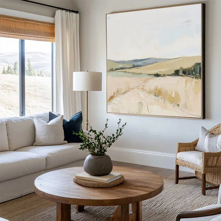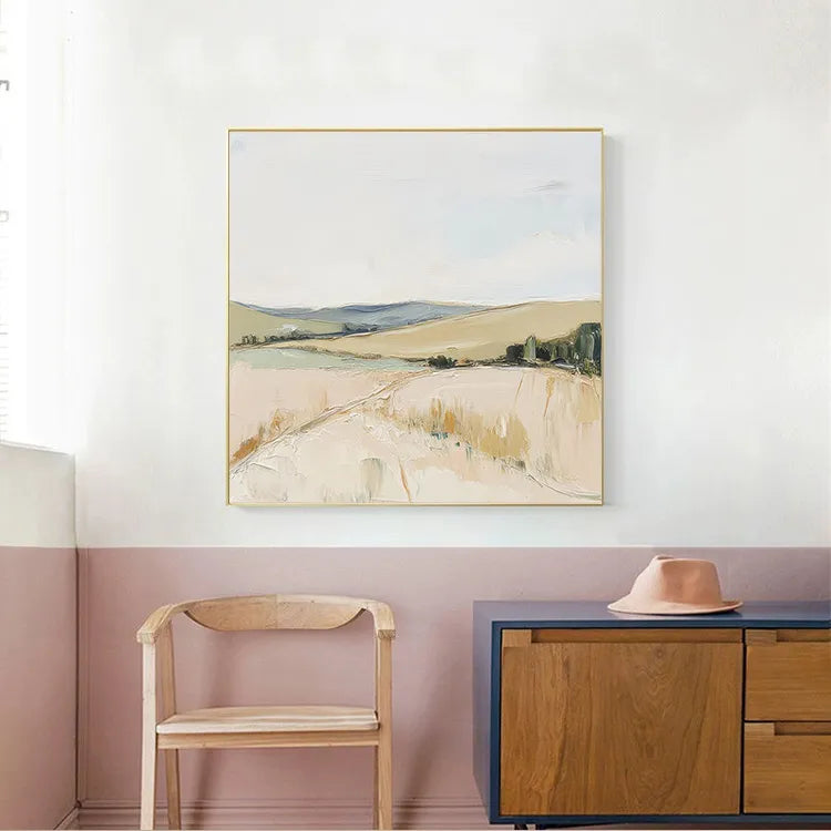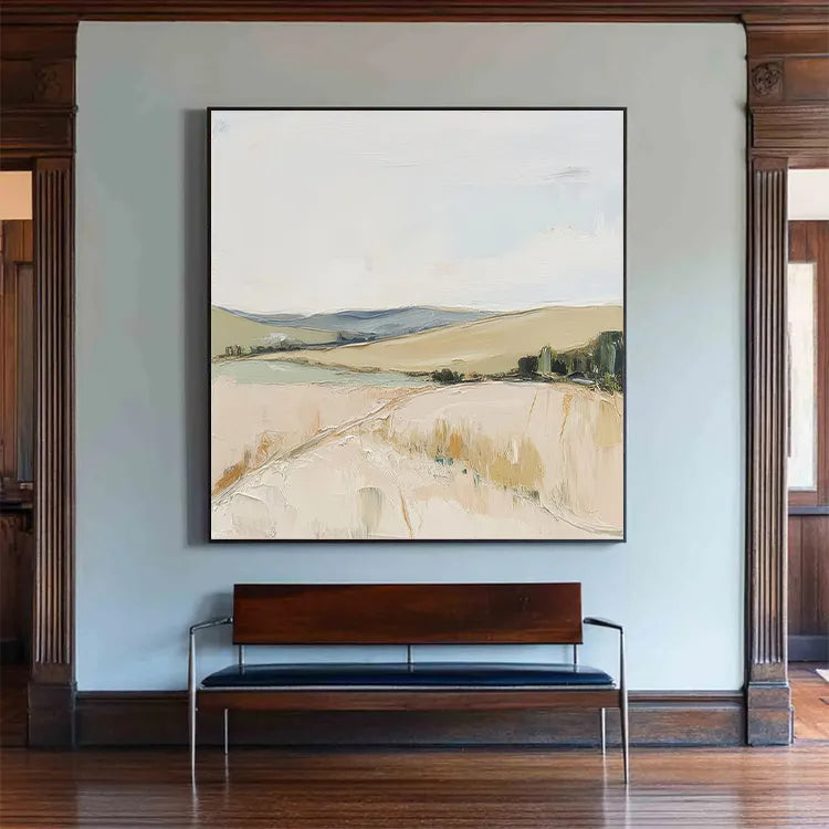 This oil painting exemplifies a minimalist approach, focusing on the subtle beauty of a rural landscape. The composition employs a gentle gradient from the foreground to the background, with soft, undulating hills and a calm sky. The use of color is restrained, with muted earth tones and pale blues, creating a serene, almost ethereal atmosphere. The brushstrokes are loose and expressive, with visible texture that adds a sense of movement and depth. The light is diffuse, suggesting either early morning or late afternoon. This work aligns with the principles of the modernist movement, particularly the emphasis on simplicity and the natural world. The lack of distinct focal points and the emphasis on the landscape's expansive quality evoke a contemplative mood.