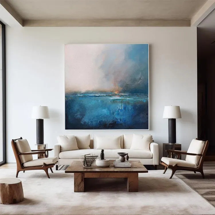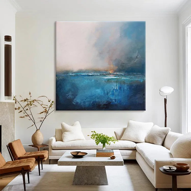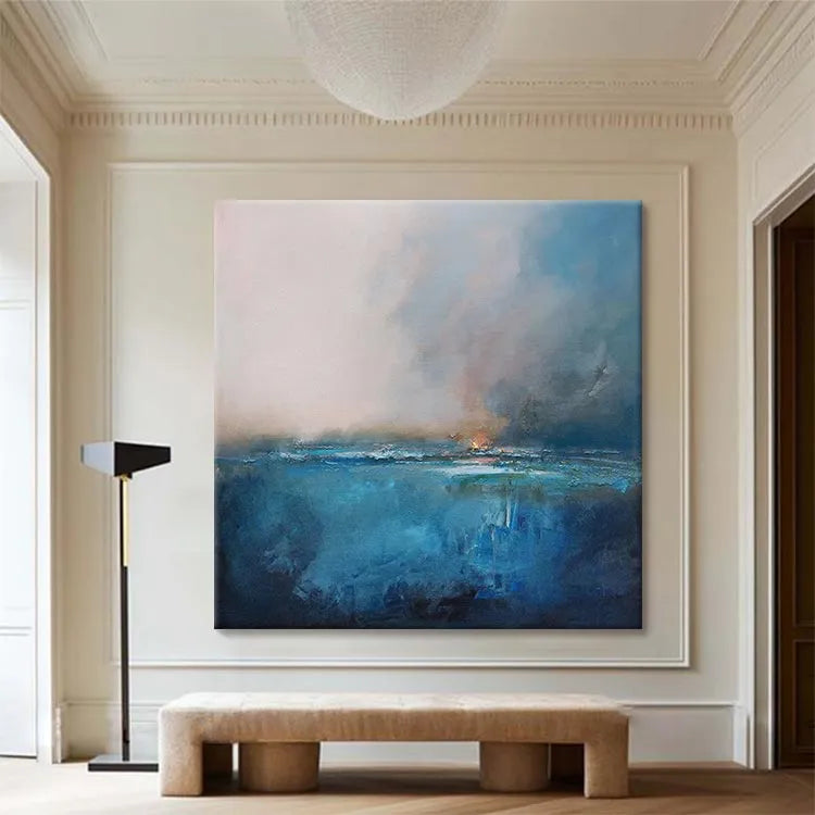 This oil painting employs a serene, yet evocative seascape style, reminiscent of the Impressionist movement. The composition features a tranquil ocean, with subtle waves and a distant horizon. The color palette is dominated by cool blues and warm pinks, creating a harmonious contrast that evokes a sense of calm and introspection. The use of light is masterful, with soft, diffused illumination suggesting either dawn or dusk. The brushstrokes are loose and fluid, contributing to the painting's ethereal quality. Textural variations in the water and sky are expertly rendered, with visible yet delicate layers of paint. The overall effect is dreamlike, with a symbolic representation of the ever-changing nature of the sea and sky.