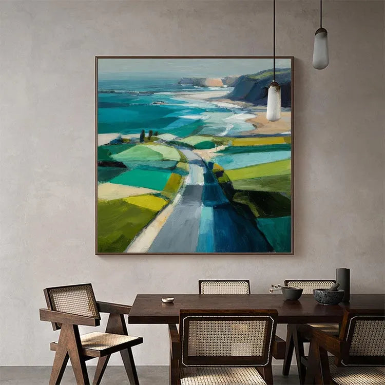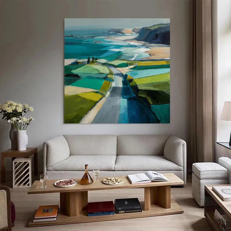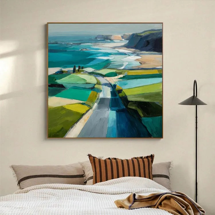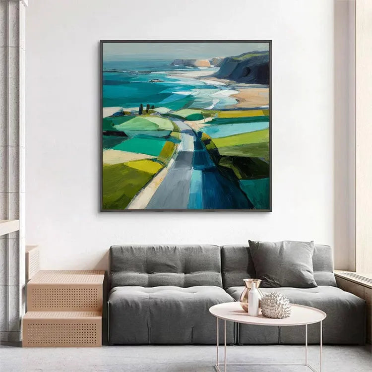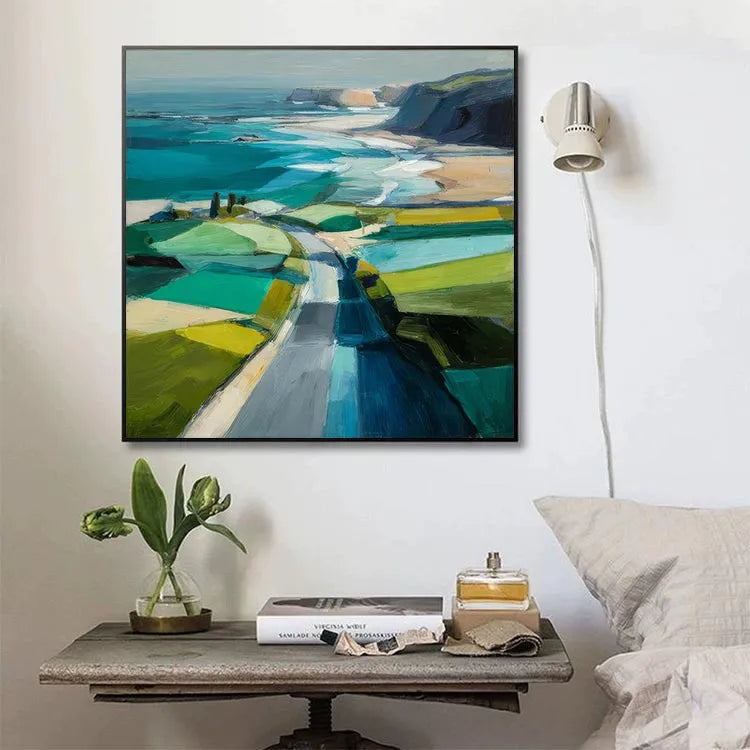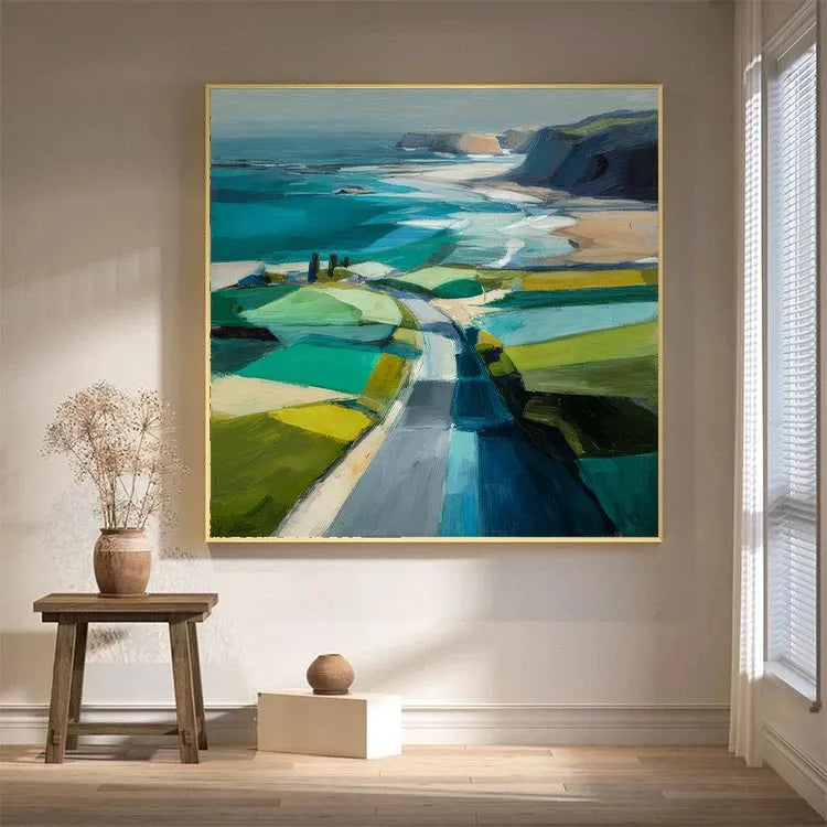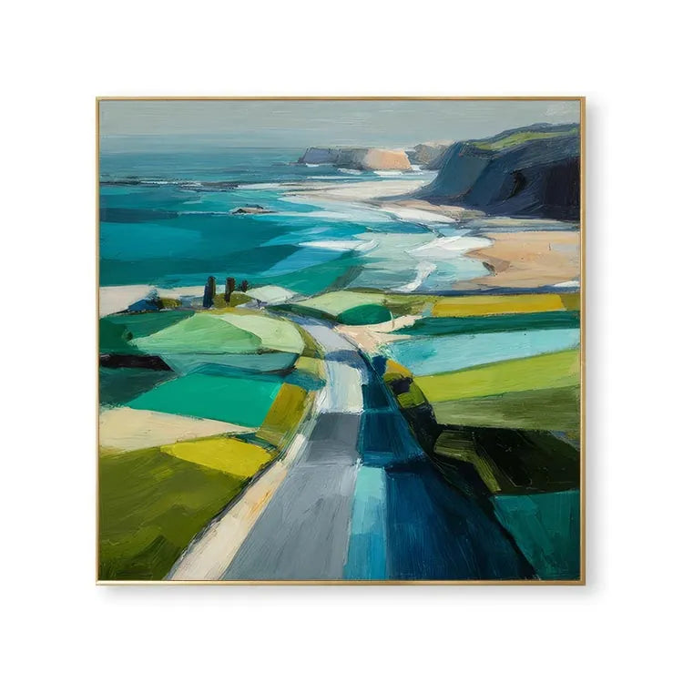 This painting exemplifies a modern, impressionistic style with its bold, expressive brushstrokes and vibrant color palette. The composition directs the viewer's eye along a winding path that leads from the foreground to the distant cliffs, creating a sense of depth and journey. The use of color is dynamic, with contrasting shades of green, blue, and yellow in the fields, and the ocean's turquoise and deep blue hues. Light is suggested through the bright, almost luminous patches of color, enhancing the sense of a sunny day. The textured brushstrokes add a tactile quality, reminiscent of both the natural landscape and the painter's physical process. The painting's abstract yet recognizable forms suggest a connection to the landscape movement, emphasizing the beauty and simplicity of nature.