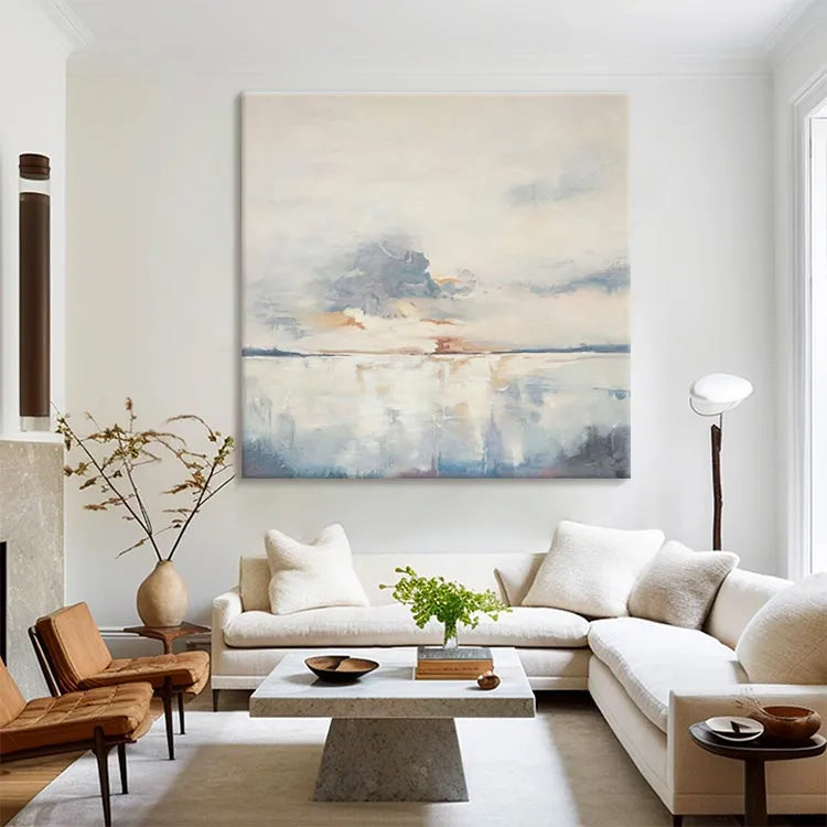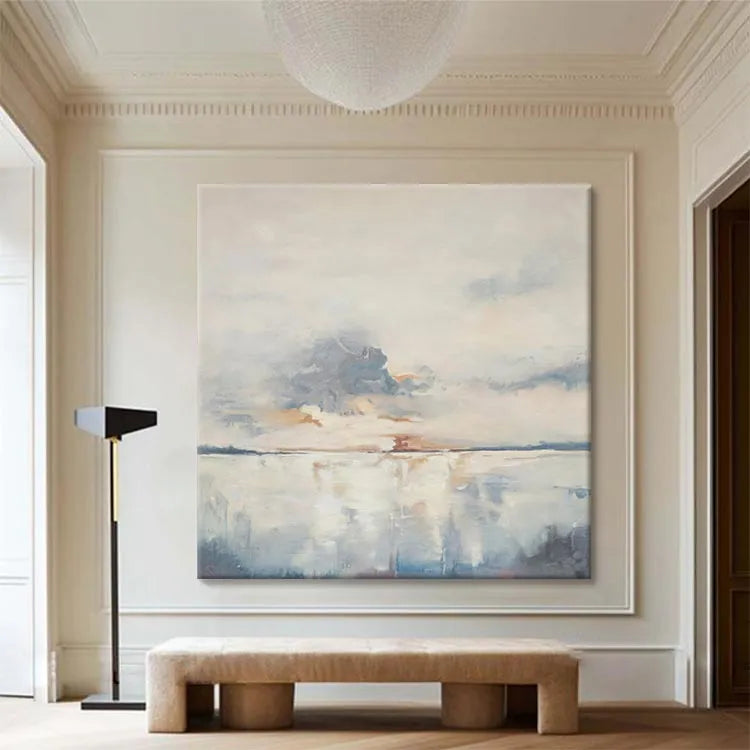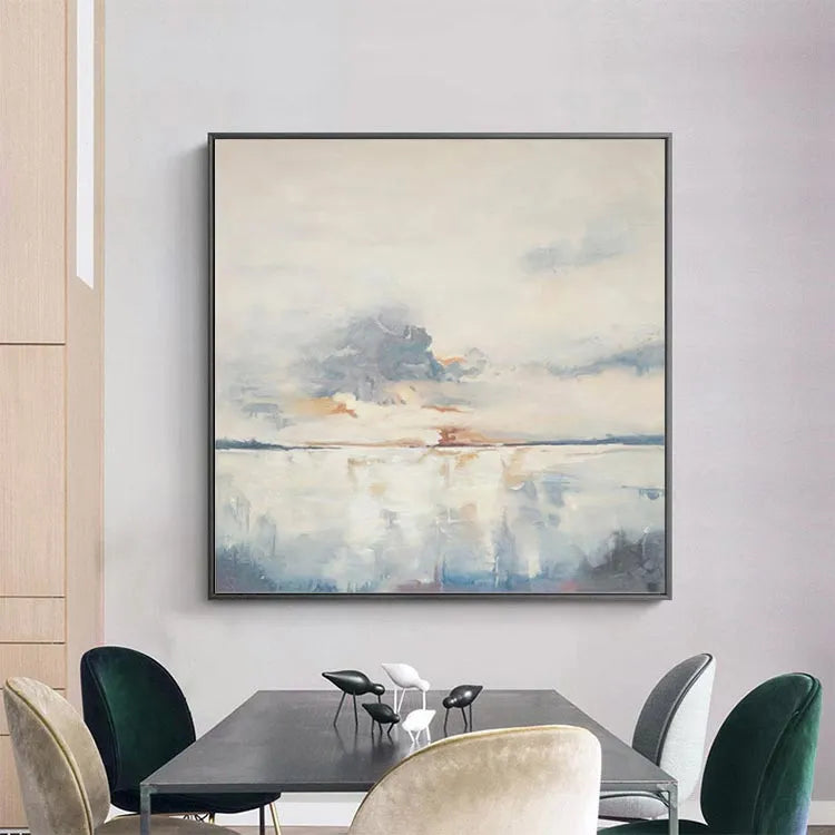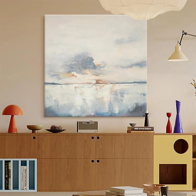 This oil painting presents a serene, minimalist landscape, characterized by its soft, diffused light and subtle color palette. The composition is balanced, with a calm horizon line dividing the sky and water. The artist employs loose, fluid brushstrokes, creating a sense of movement in the clouds and reflections on the water's surface. The use of pale blues, grays, and warm oranges evokes a tranquil, almost ethereal mood. The texture is smooth, with visible brushstrokes adding a sense of spontaneity. The painting's style is reminiscent of Impressionism, focusing on light and atmosphere rather than detailed realism. The gentle blending of colors and the reflective quality of the water suggest a peaceful, contemplative moment.