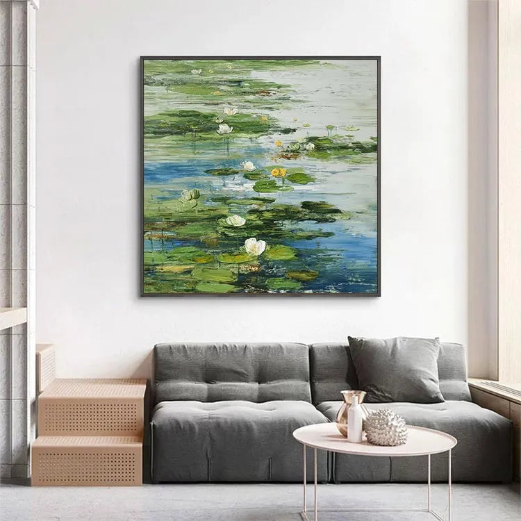 This painting, likely belonging to the Impressionist movement, captures a serene pond scene with delicate water lilies and lotus flowers. The artist employs a soft, fluid brushstroke technique, creating a sense of gentle movement in the water. The color palette is predominantly green and blue, with white lilies providing a striking contrast. Light is subtly diffused across the surface, reflecting the lilies and leaves, enhancing the tranquil atmosphere. The texture is smooth, with visible, yet subtle, brushstrokes that mimic the natural ripples on the water. The composition is balanced, with lilies and leaves distributed across the canvas, guiding the viewer's eye from the foreground to the background. Symbolically, the lilies may represent purity and beauty, while the pond reflects a peaceful, natural world.