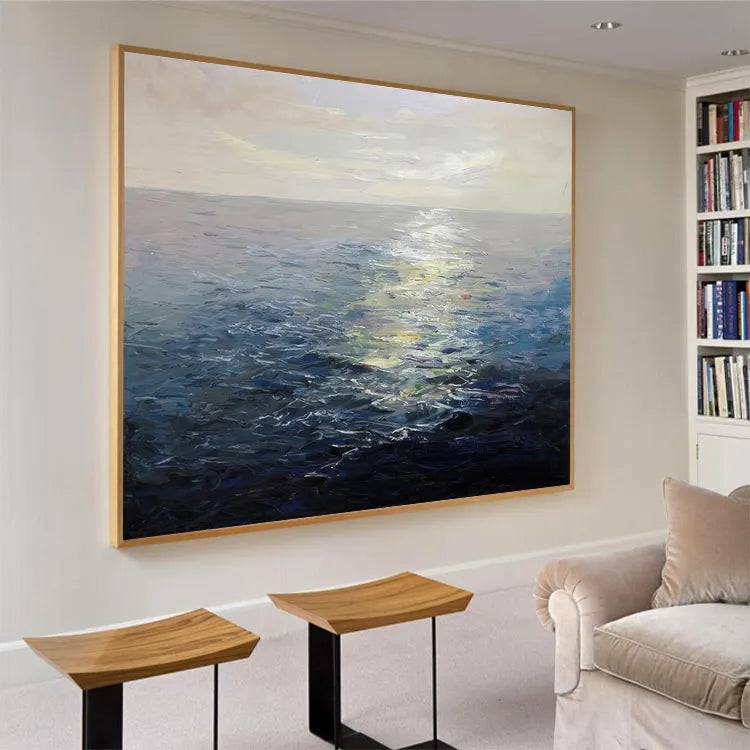This oil painting captures a serene seascape, characterized by its impressionistic style. The composition focuses on the shimmering reflection of light on the water's surface, creating a dynamic yet tranquil effect. The artist employs a delicate interplay of colors, predominantly blues and whites, with subtle hints of yellow and pink, suggesting dawn or dusk. The use of light is masterful, with a bright, almost ethereal central beam of light that draws the viewer's eye across the canvas. Textural brushstrokes add depth and movement to the water, contrasting the smooth, diffused sky above. The painting's subtle, almost ghostly colors and light suggest a calm, meditative mood, aligning with the Impressionist movement's emphasis on light and transient beauty.