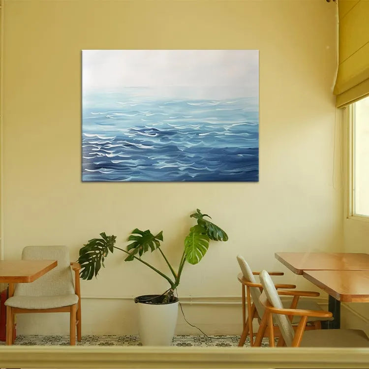 This oil painting, depicts a serene ocean scene. The composition employs a minimalist approach, focusing on the gentle ripples of the water. The artist uses a restricted color palette dominated by various shades of blue, creating a calming and cohesive visual effect. The light is subtly diffused, suggesting a cloudy sky, which enhances the tranquil mood. The texture of the water is rendered with smooth, almost fluid brushstrokes, adding a sense of movement. The subtle gradation from darker to lighter blues in the water suggests depth and distance. The style is reminiscent of modern abstract art, with a focus on natural forms and minimalism. The lack of distinct figures or objects directs attention to the beauty of the natural world.