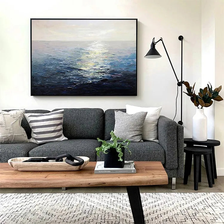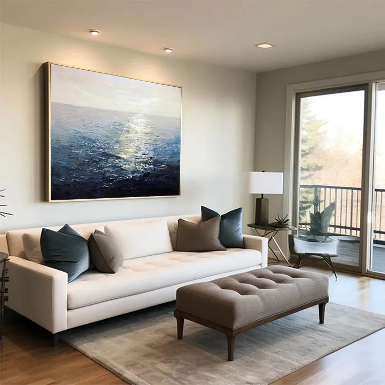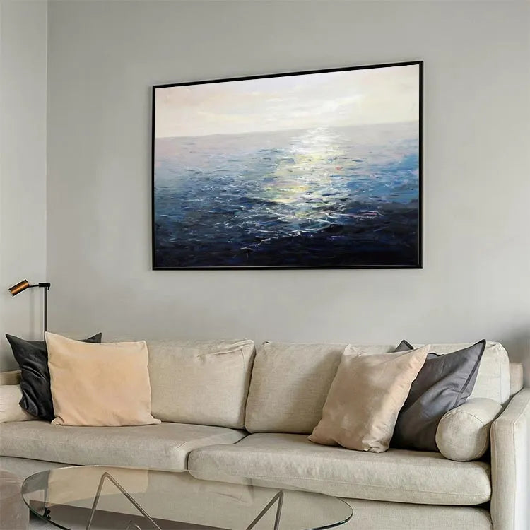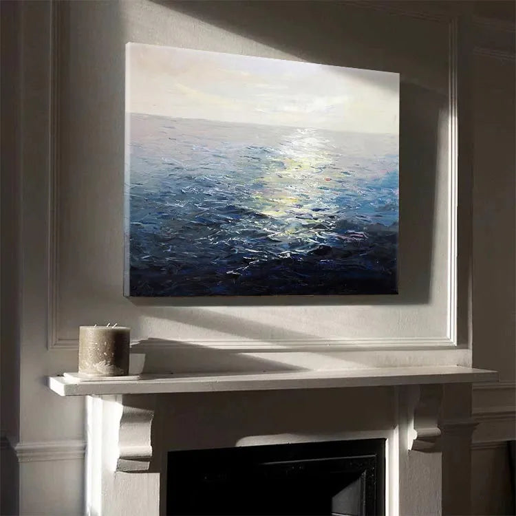 This oil painting, a painting of a shimmering sea, exhibits the characteristics of Impressionism with its emphasis on light and its fleeting, ephemeral quality. The composition is minimalist, focusing on the interplay between the sun's reflection on the water's surface and the vast, open sky. The artist employs a delicate, almost ethereal color palette, with soft blues, greens, and whites, creating a serene, calming effect. The texture is evident in the visible brushstrokes, which add a dynamic, almost tactile quality to the water. The use of light is masterful, with the sun's reflection creating a luminous pathway through the sea, symbolizing hope or the journey forward. The subtle gradations in color and light suggest a dawn or dusk setting, enhancing the painting's tranquil, reflective mood.