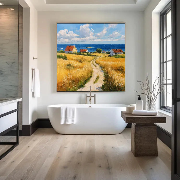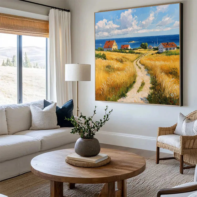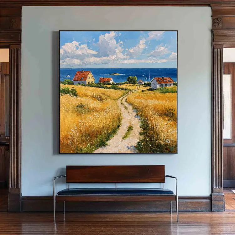 This oil painting, reminiscent of the Impressionist movement, showcases a serene coastal landscape. The composition leads the viewer's eye along a winding, dirt path through golden, grassy fields, towards a cluster of quaint, white houses with red-tiled roofs. The artist employs a vibrant color palette, with vivid blues of the ocean contrasting against the warm yellows and greens of the land. The use of light and shadow is masterful, capturing the luminosity of a sunny day with soft, diffused light. Brushstrokes are visible, adding texture to the grass and clouds, enhancing the painting's sense of movement and life. The symbolic representation of rural tranquility and the beauty of nature is palpable.