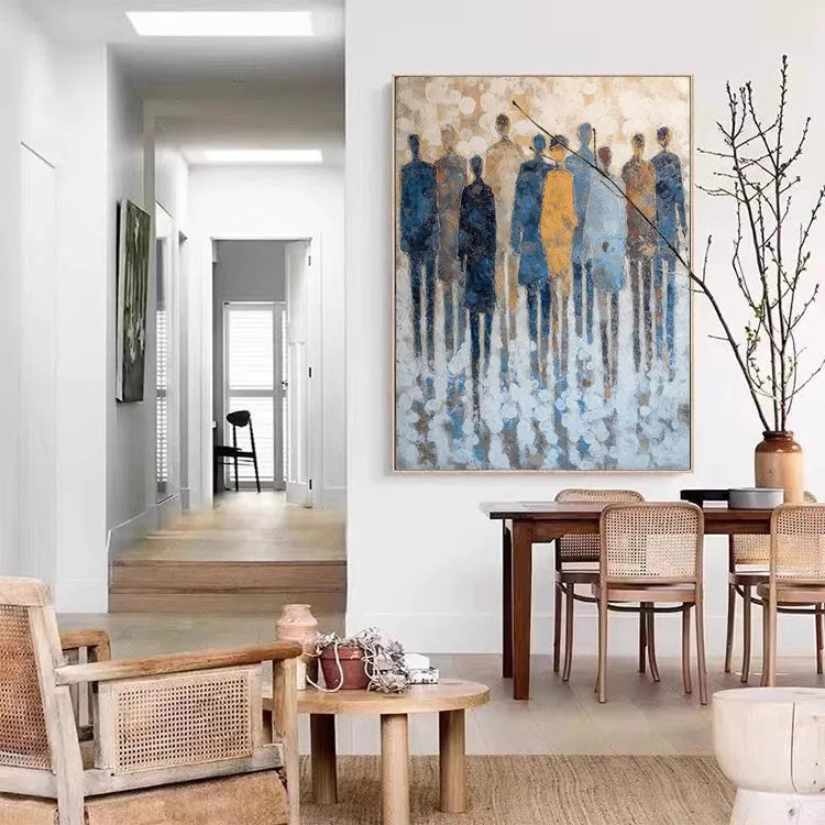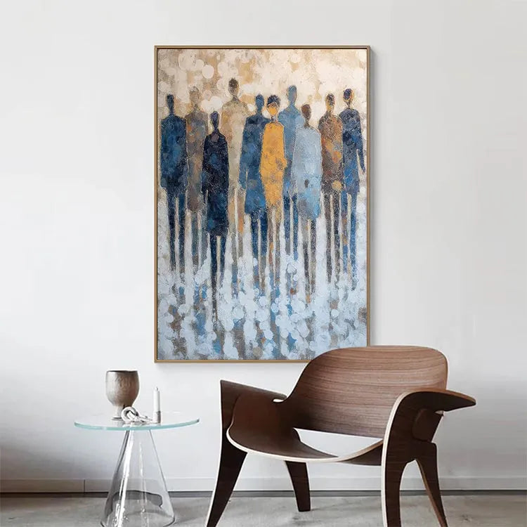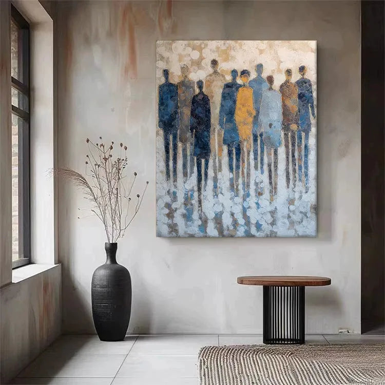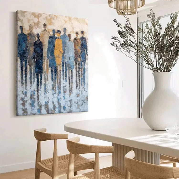 This painting employs a minimalist, abstract style, reminiscent of Expressionism, with a focus on form and color rather than detailed realism. The composition features a group of indistinct, silhouette-like figures standing in a row, their outlines softened by textured brushstrokes. The color palette is restrained, with dominant shades of blue, yellow, and beige, creating a subtle yet compelling contrast. The use of light and shadow is minimalistic, with the figures' colors suggesting varying degrees of illumination. The textured background, with its white, circular patterns, adds a dreamlike quality, enhancing the painting's symbolic nature. The brushwork is loose and impasto, contributing to the overall sense of movement and fluidity. This piece effectively uses simplicity to evoke emotion and contemplation.
